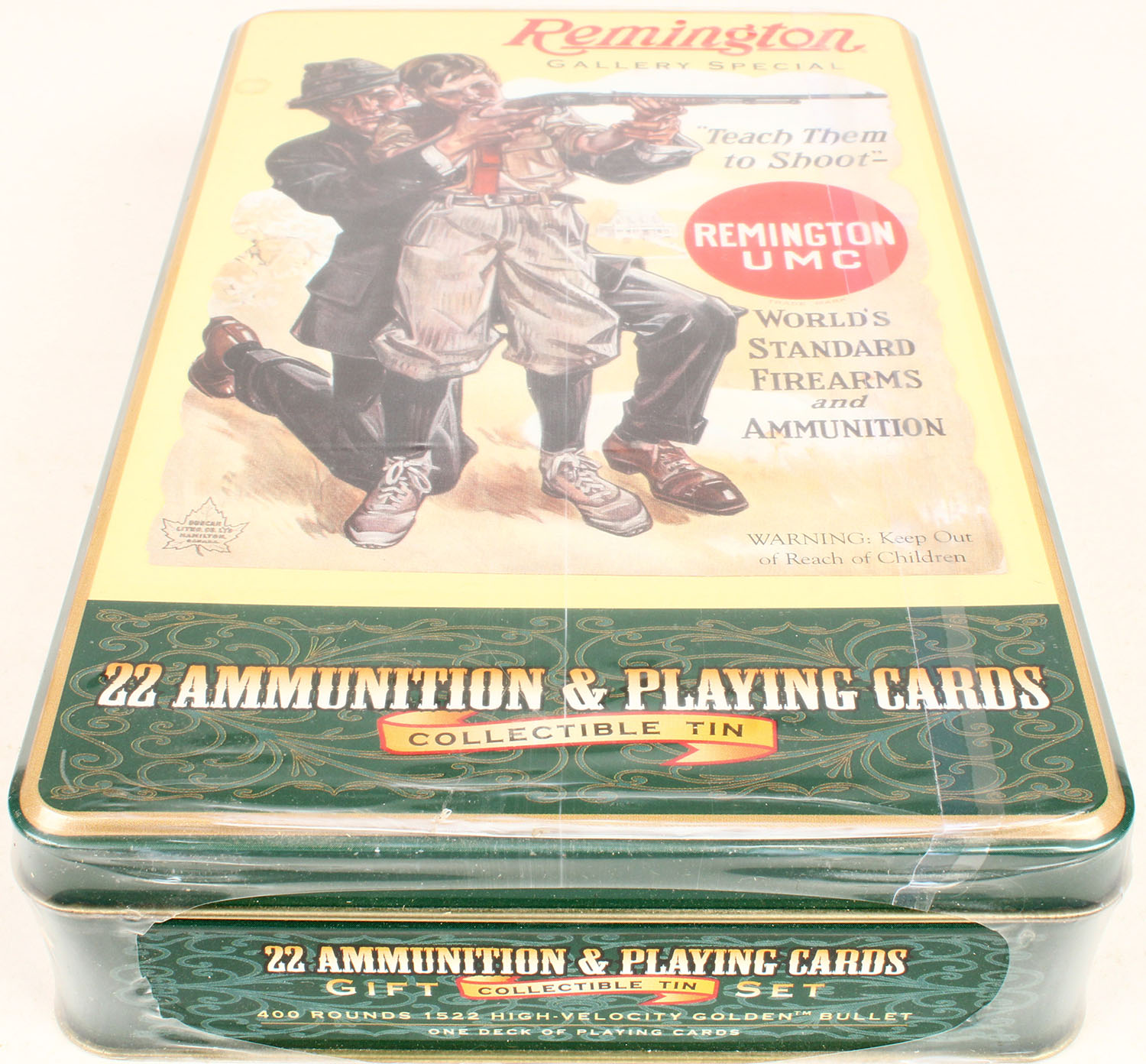 Remington, Golden Bullet .22 Long Rifle, High-Velocity, ammo and playing cards tin, Full & Sealed, 400rds., pictures dad showing son how to shoot. Grade: MINT - Value: 20 to 60