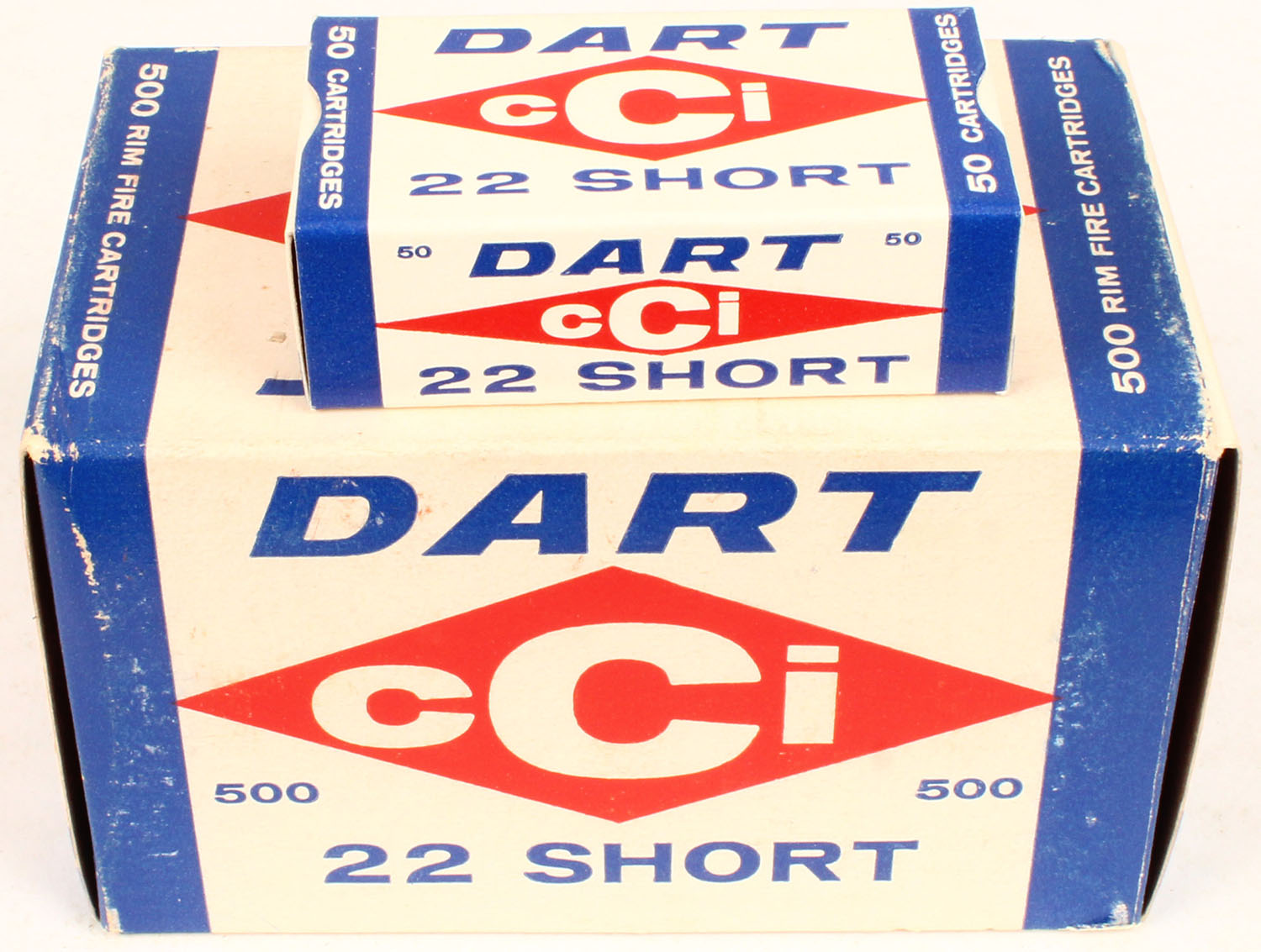 CCi, Dart, .22 Short, Full, 500rds., 1pc. White blue & red brick, brick is solid with excellent color, only very minor age soiling & shelf wear, very minor corner wear, edges are mostly crisp, inside boxes are mint. Grade: Excellent ++ - Value: 50 to 150