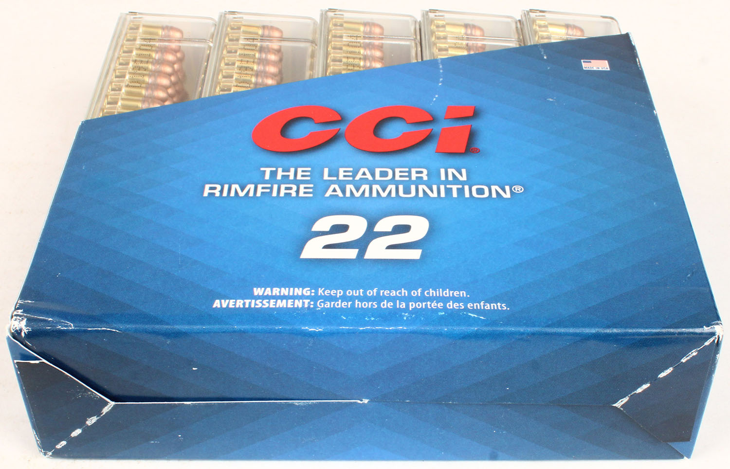 CCi, .22 Short, Copper-Plated Hollow Point, Full, 500rds. 1pc. Blue white & red open top brick, brick is near mint with only very minor shelf wear, inside boxes are mint. Grade: Excellent ++ - Value: 40 to 60