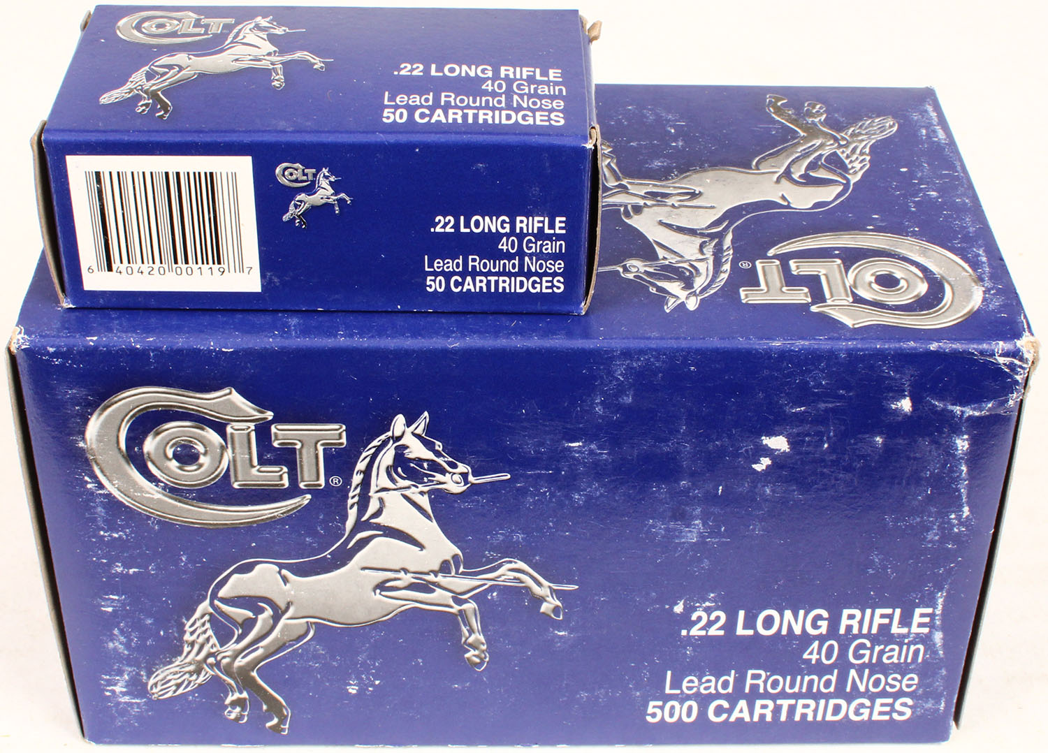 Aguila, Colt, .22 Long Rifle, 40 Grain Lead Round Nose, Full, 500rds. 1pc. Blue & silver brick, brick is solid with excellent to minty color, some shelf wear, very minor corner wear, edges are crisp, end flaps are solid, inside boxes are mint. Grade: Excellent + - Value: 200 to 400