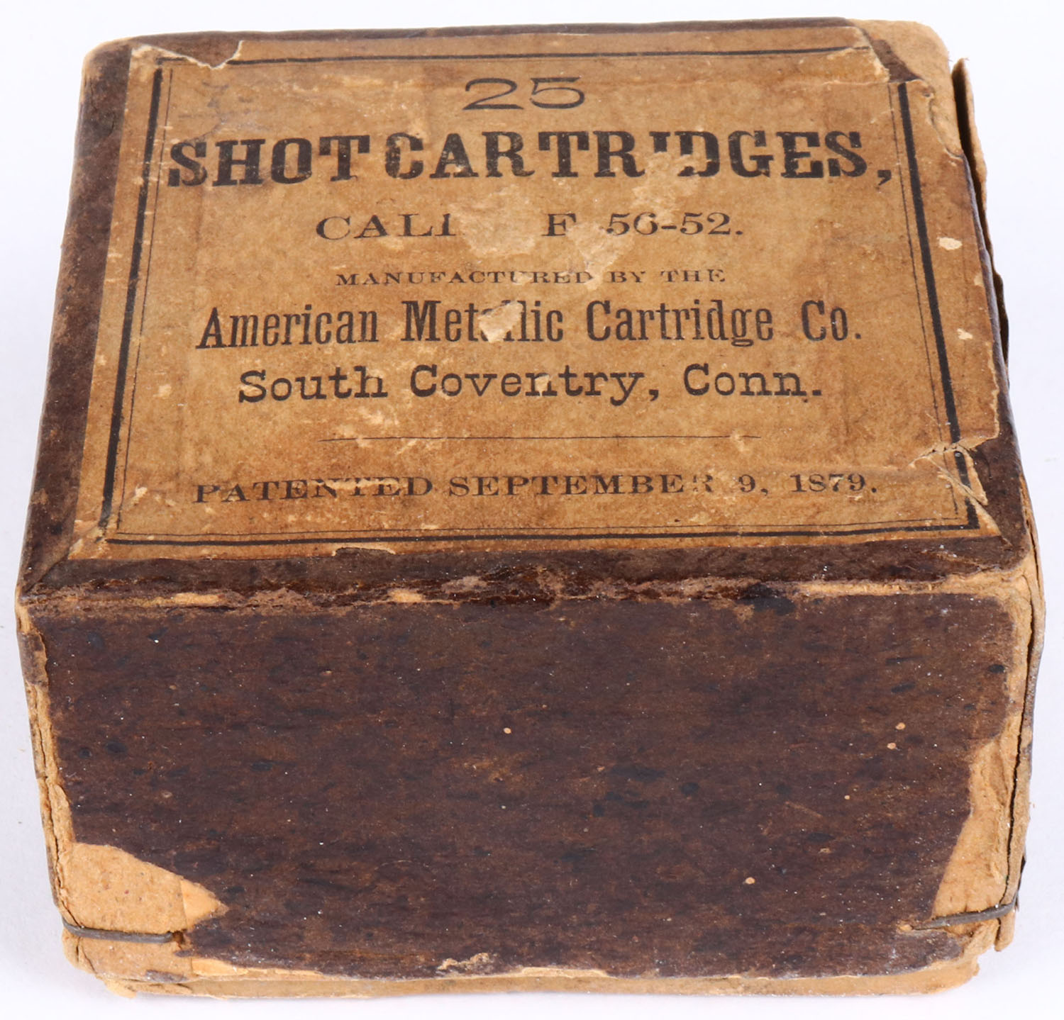 American Metallic Cart. Co., 56-52 SHOT Cartridges, 2pc, Partial 24 Rds., brown box with buff label & black print, box is solid with one split corner seam, partial tear in lid, tears & small parts of label missing, age soiling, rub wear & edge wear, corners are slightly soft, edges are solid, ammo is good. Grade: Very Good + - Value: 500 to 1000