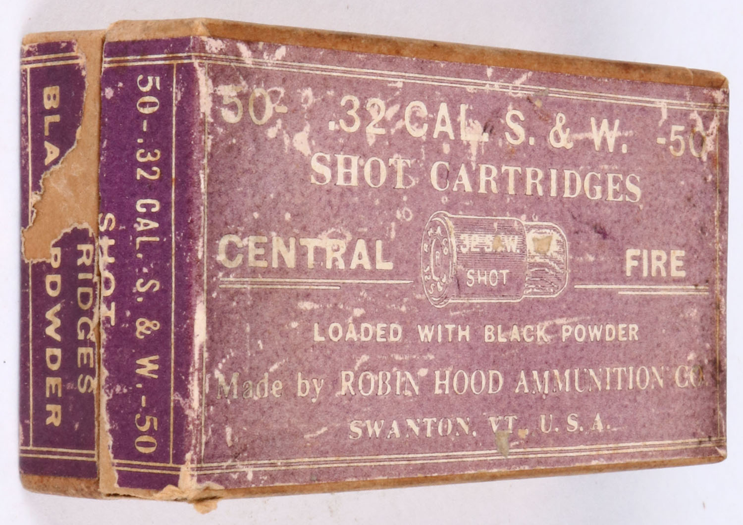 Robin Hood, .32 S&W shot cartridges, Black powder, 2pc, Full, buff box with purple label & white print, box is solid with faded top label, small tear in bottom left end label, rub marks, one corner seam split on lid, light age soiling, corners & edges are solid, ammo is good. Grade: Very Good ++ - Value: 80 to 160