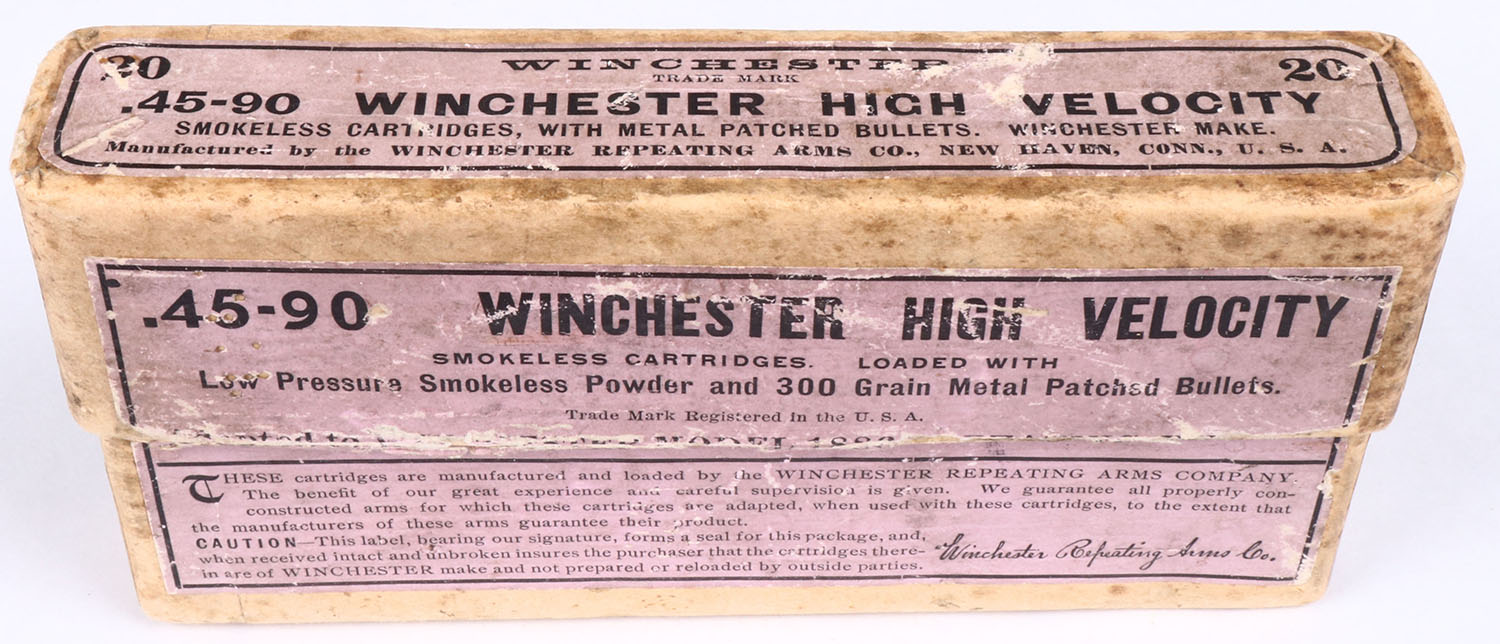Winchester, .45-90 High Velocity, Low pressure smokeless powder, 300 Gr. Metal patched Bullet, 2pc, Full, buff box with purple label & black print, box is solid with light age soiling, light scuff marks & top label, light rub marks & light edge wear, corner & edges are solid, ammo is good. Grade: Very Good ++ - Value: 800 to 1600