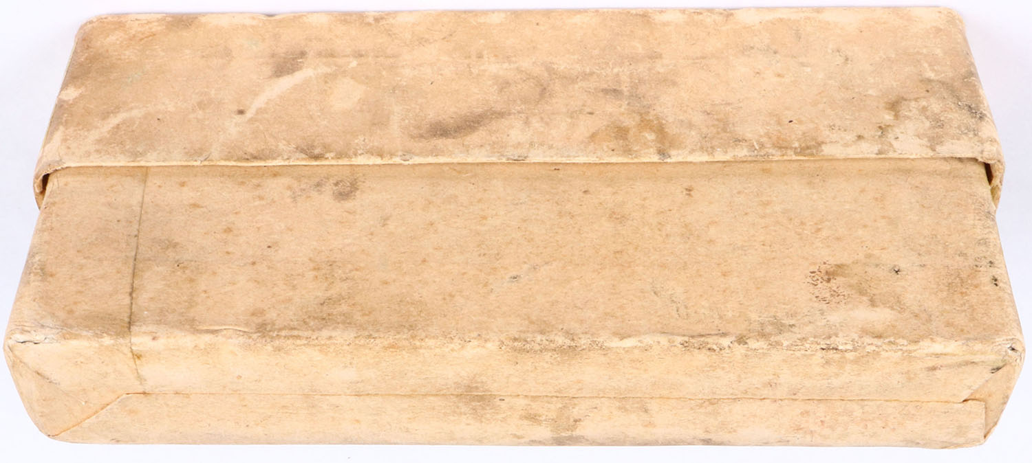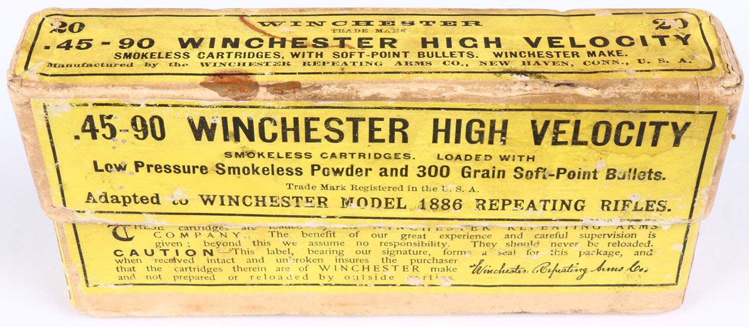 Winchester, .45-90 Winchester High Velocity, low Pressure Smokeless Powder, 300 Gr. Soft-Point bullet, 2pc, Partial 15 Rds., buff box with yellow label & black print, box is solid with stains on top label, light age soiling, rub marks & edge wear, ammo is good. Grade: Very Good ++ - Value: 600 to 1200