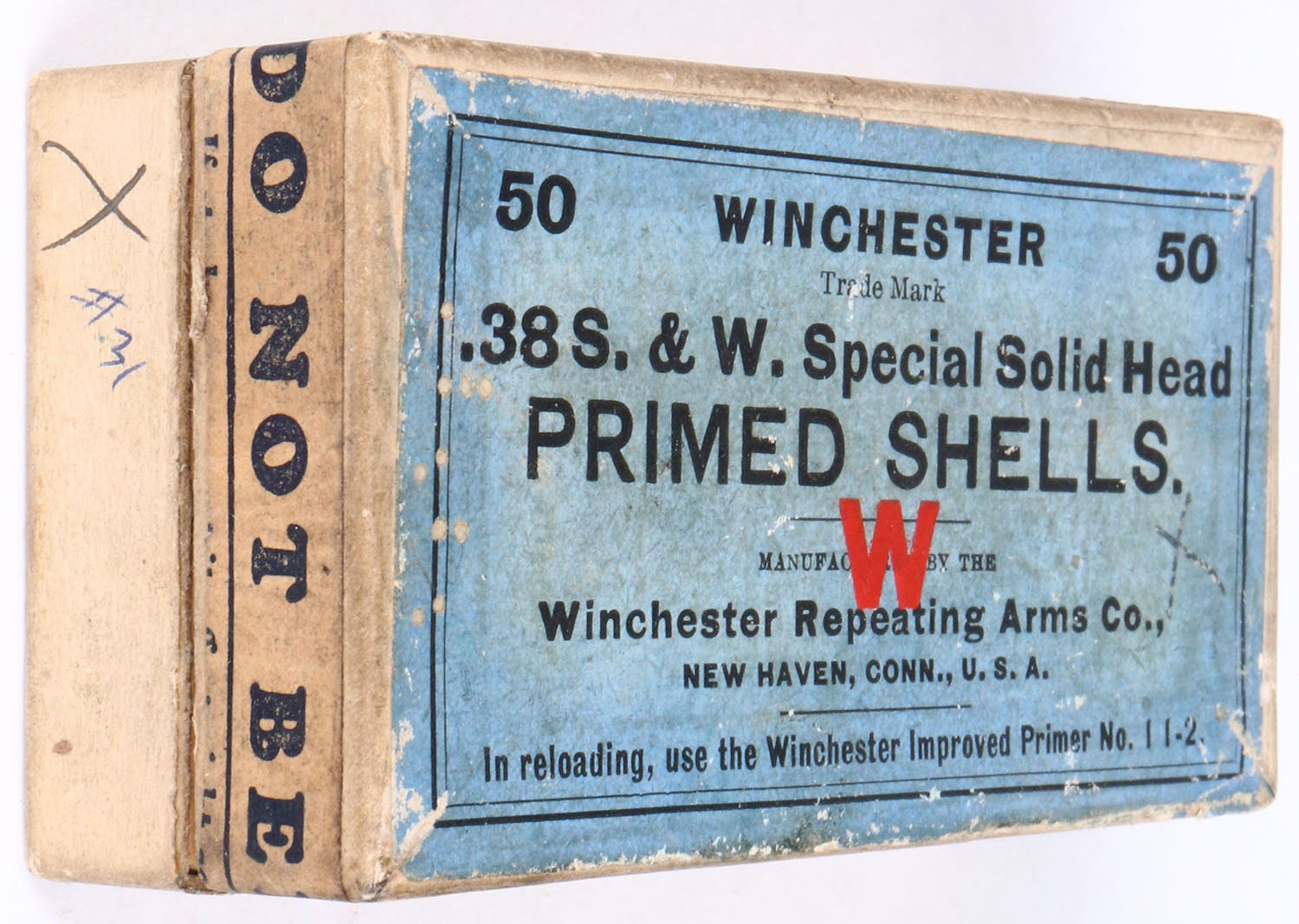 Winchester, .38 S&W special solid head primed shells, 2pc, Full, buff box with blue label & black/red print, box is solid with pencil marks, light age soiling, light rub marks & light edge wear, shells range from very good to good. Grade: Excellent - Value: 20 to 200
