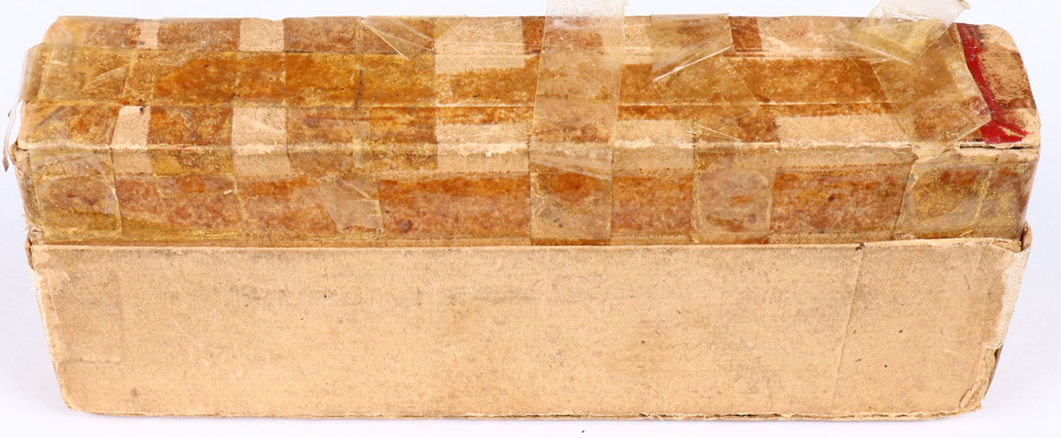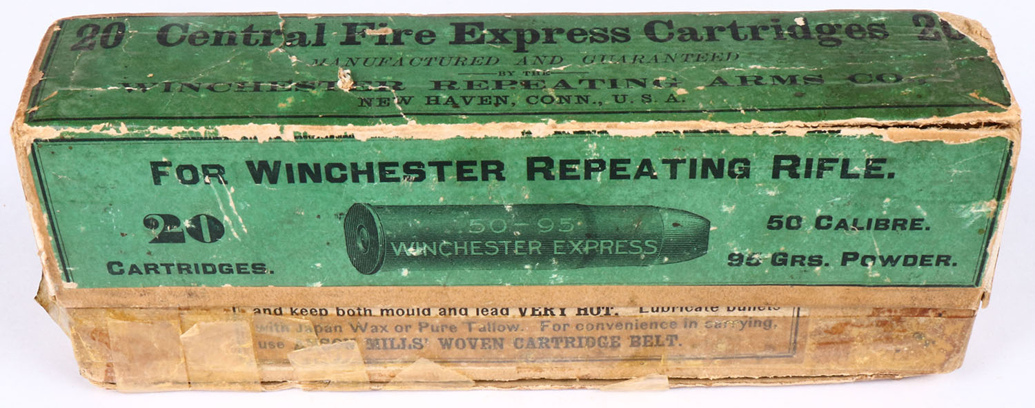 Winchester, .50-95, For Winchester Repeating Rifle, Partial 19rds. 2pc. Buff box with green label, box has several seam splits, bottom is completely torn and covered in tape, lid has 3 sea, splits, very good color, age soiling, edge wear, ammo is excellent. Grade: Very Good - Value: 40 to 200