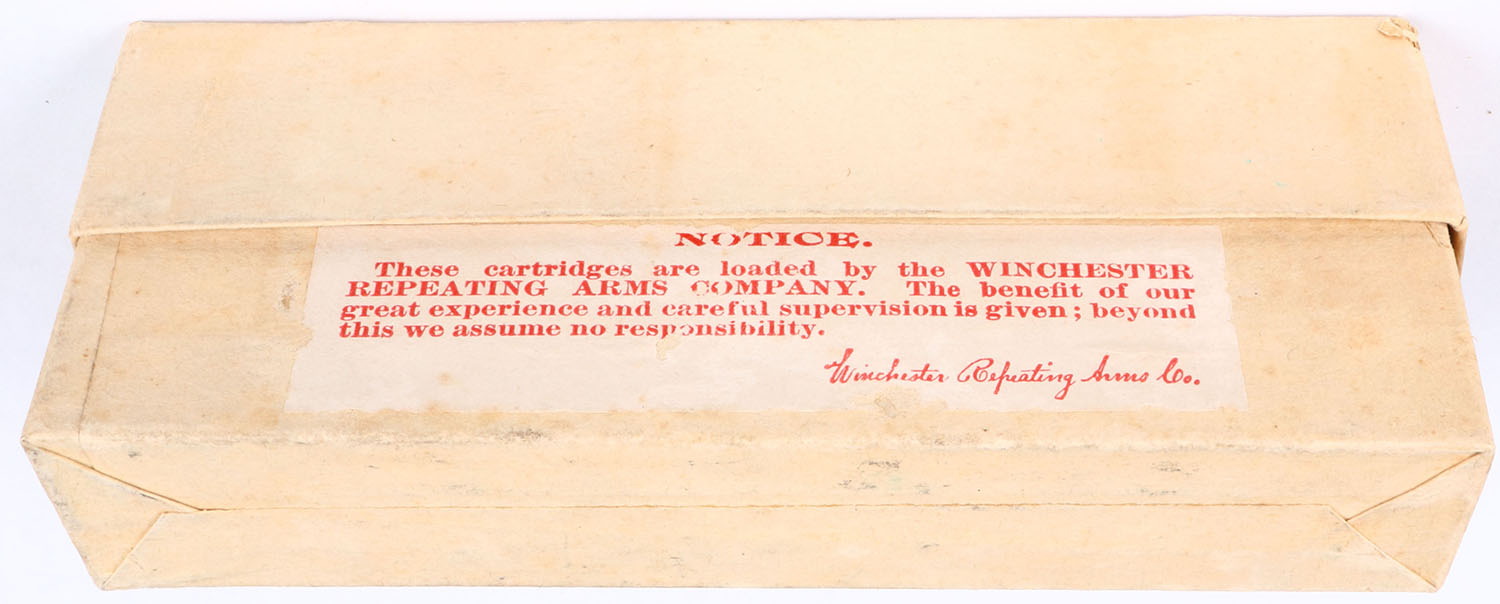 Winchester, .45-75, Model ''Centennial'' 1876, Full, 2pc. Buff box with green label & black print, box has very good color, light rub marks & light edge wear, ammo is excellent. Grade: Excellent ++ - Value: 200 to 600