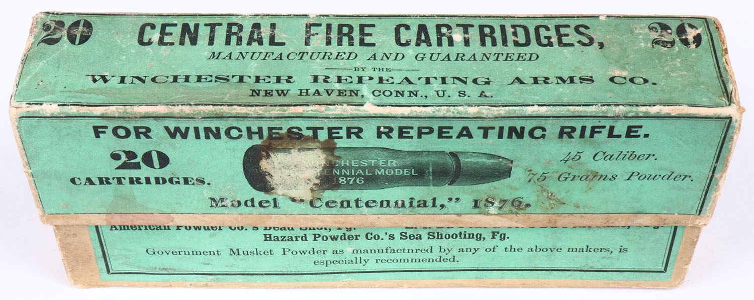 Winchester, .45-75, Model ''Centennial'' 1876, 2pc, Full, buff box with green label & black print, box is solid with rub marks, edge wear, & stains, ammo is very good. Grade: Excellent - Value: 150 to 500