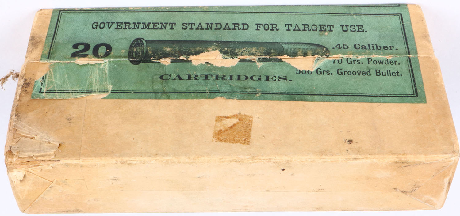 Winchester, .45-70 Extra Heavy Solid Head, Government Standard for Target Use, 500 Gr. Grooved Bullet, 2pc, Full, buff box with green label & black print, box is solid with light age soiling/stains, sticker mark, rub marks, & light edge wear, ammo is excellent to very good. Grade: Excellent - Value: 100 to 300