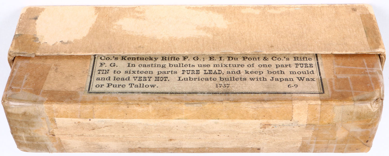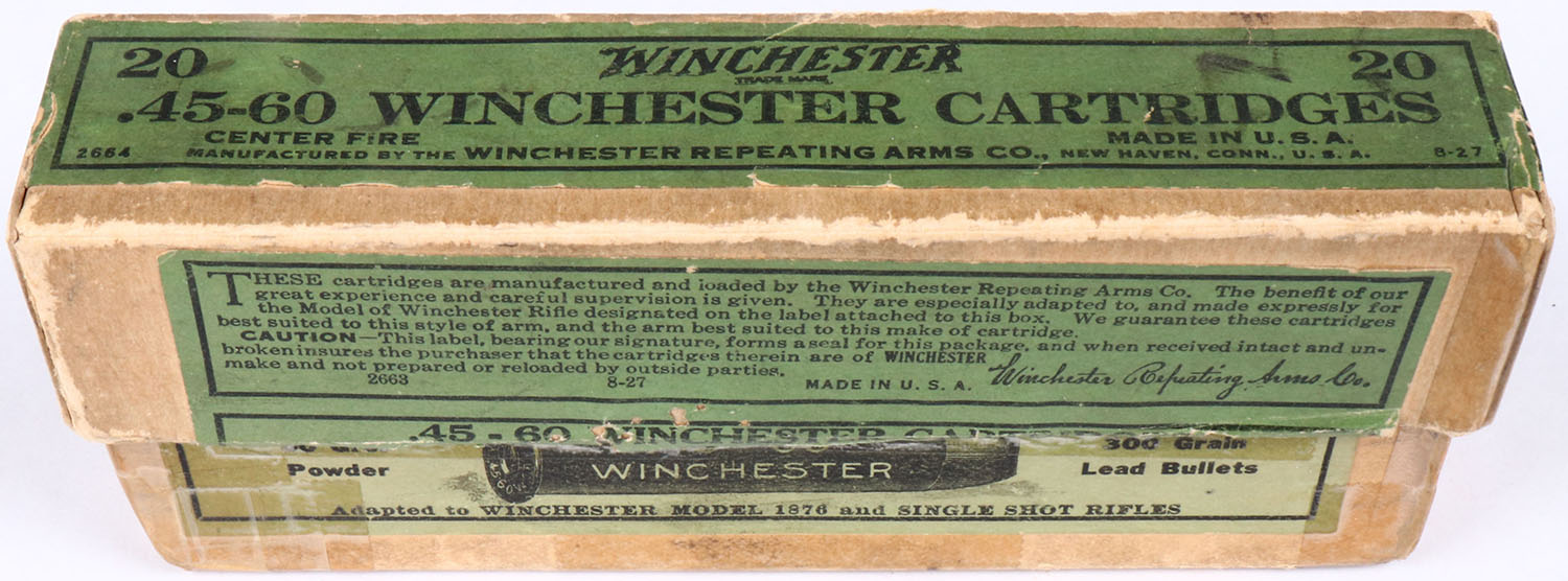 Winchester, .45-60, 300 Gr. Lead Bullet, 2pc, Partial 19 Rds., buff box with green label & black print, box has multiple seam tape repairs, rub marks, & edge wear, ammo is very good. Grade: Excellent - Value: 100 to 300