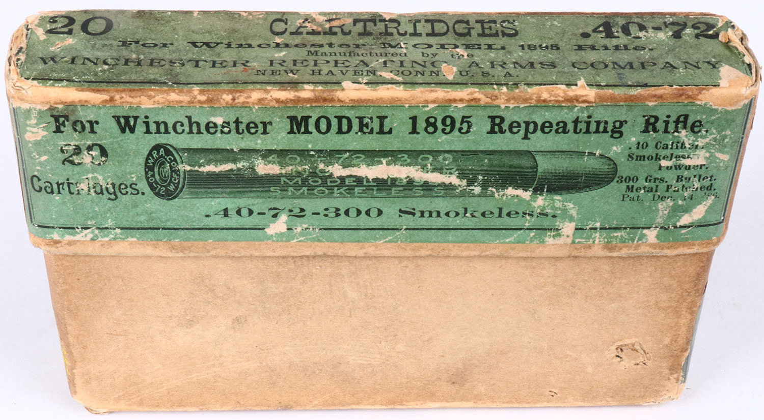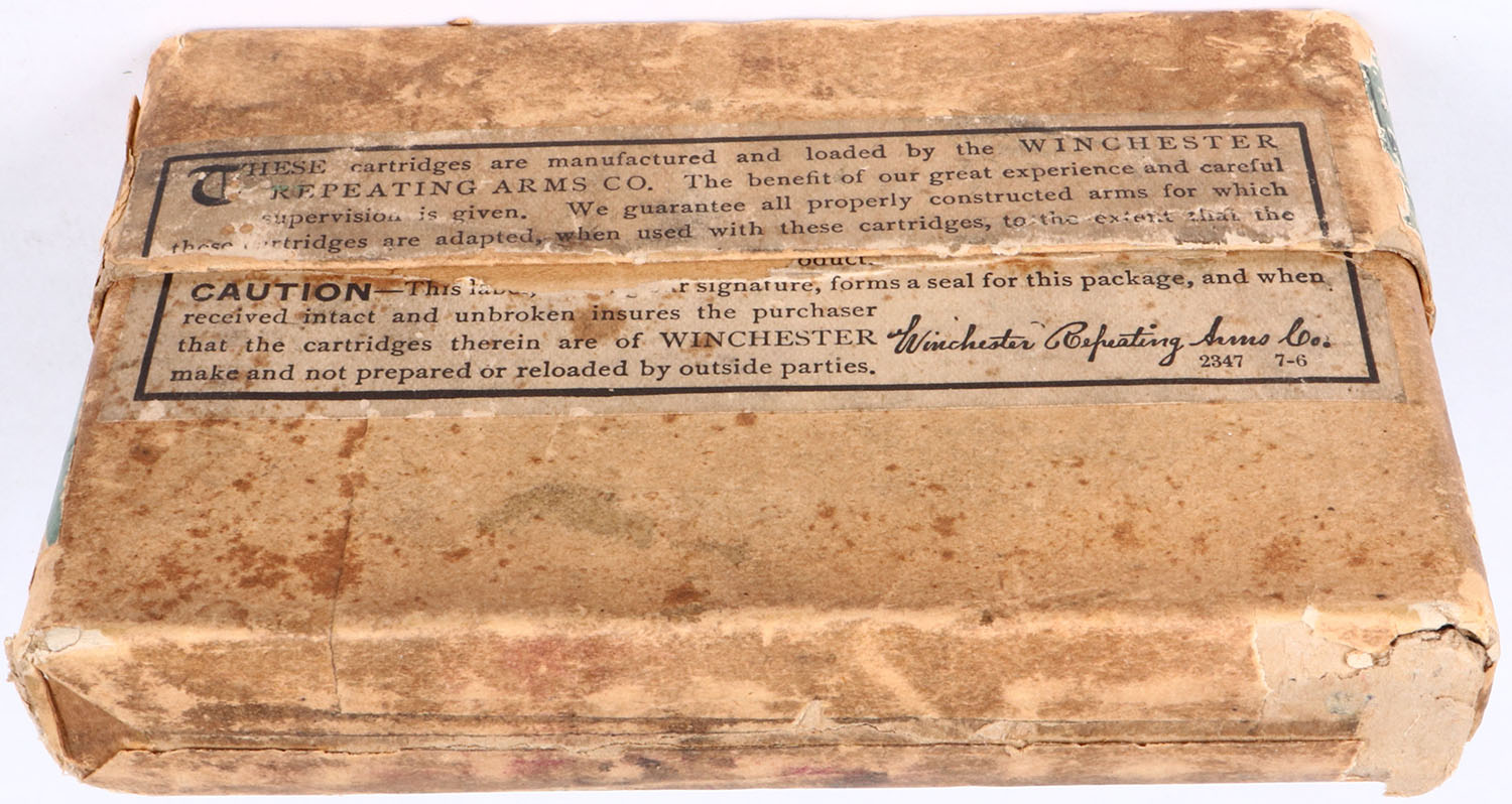 Winchester, .40-72, Smokeless, .300 Gr. Metal patched soft point bullet, 2pc, Full, buff box with green label & black print, box is solid with age soiling, rub marks, & edge wear, ammo is very good. Grade: Very Good ++ - Value: 150 to 300
