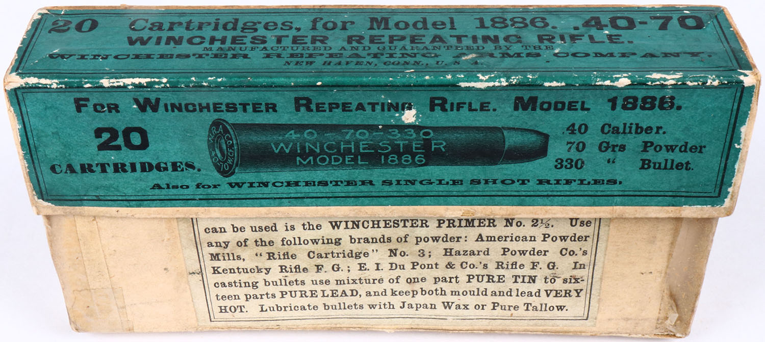 Winchester, .40-70, .330 Gr. Bullet, 2pc, Full, buff box with green label & black print, box is solid with tape on edges & bottom, light stains, light rub marks & light edge wear, ammo is excellent. Grade: Very Good ++ - Value: 80 to 160