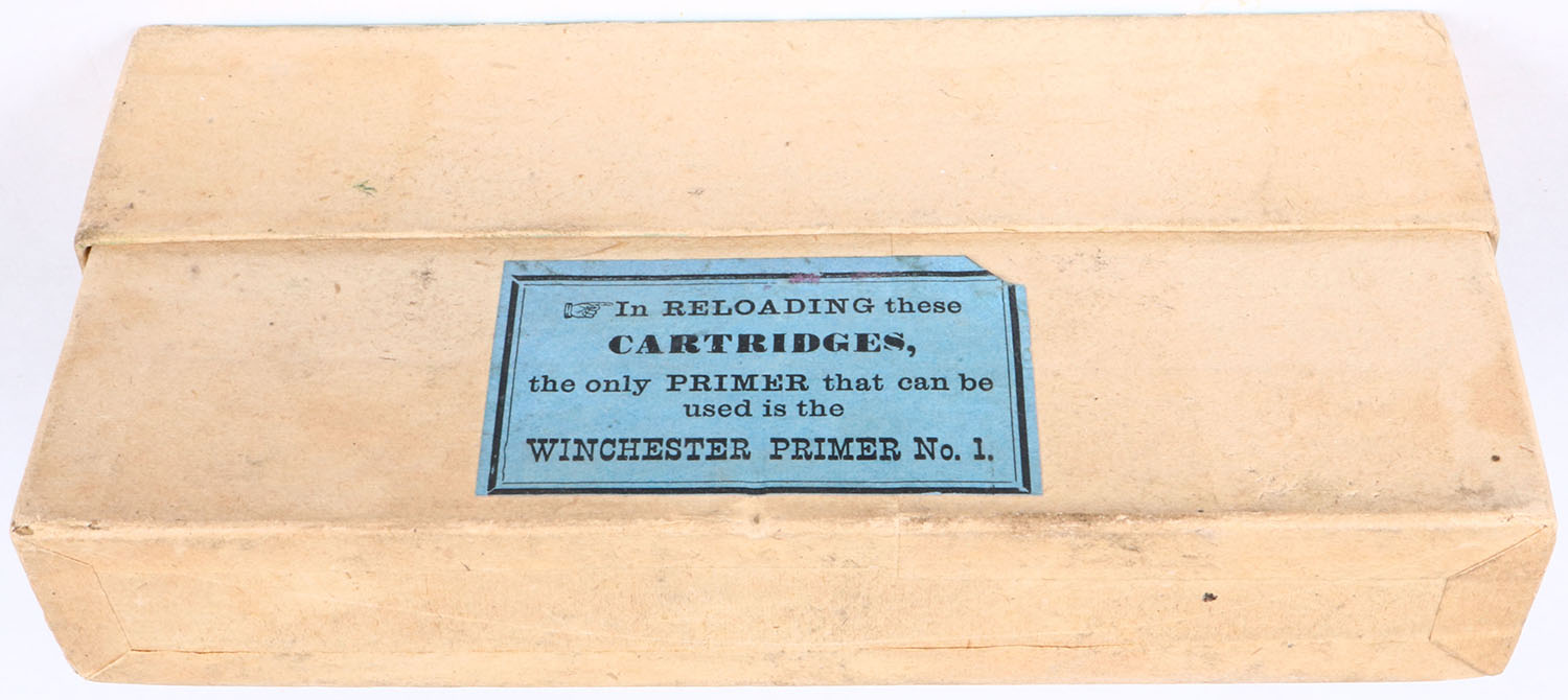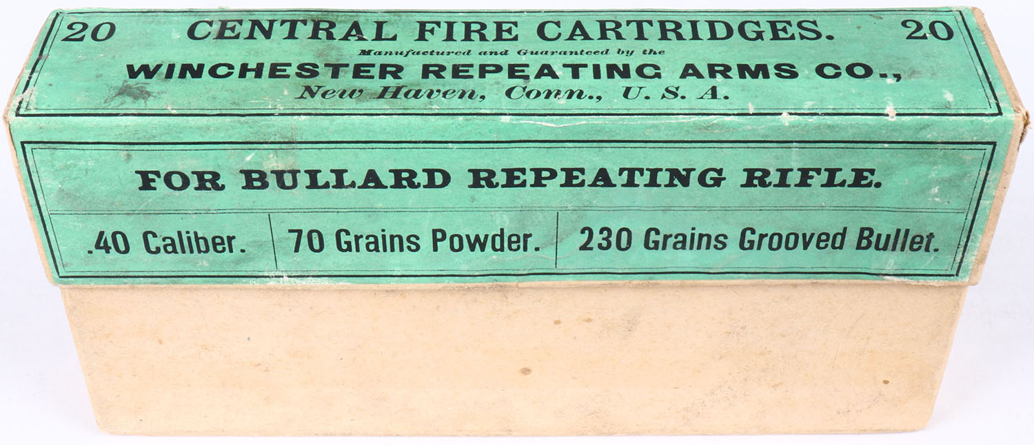 Winchester, .40-70, 230 Gr. Grooved Bullet, For Bullard Repeating Rifle, 2pc, Full, buff box with green label & black print, box is solid with rub marks & edge wear, ammo is very good. Grade: Excellent - Value: 100 to 300