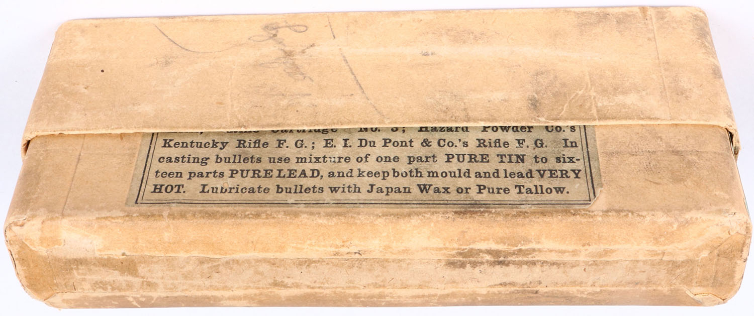 Winchester, .40-65, 260 Gr. Bullet, 2pc, Full, buff box with green(faded yellow) label & black print, box is solid with light age soiling, pen marks, rub marks, & edge wear, ammo is very good. Grade: Excellent - Value: 100 to 300