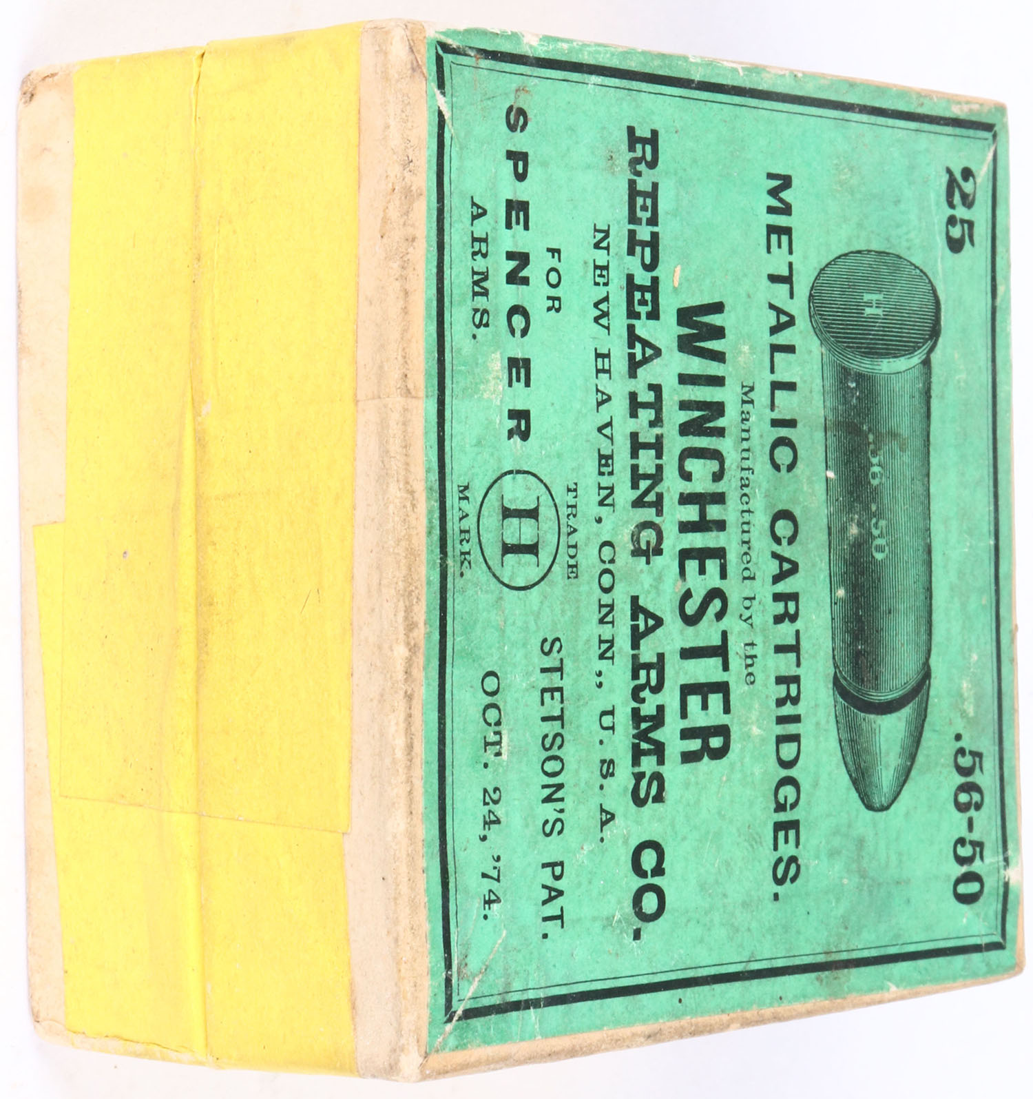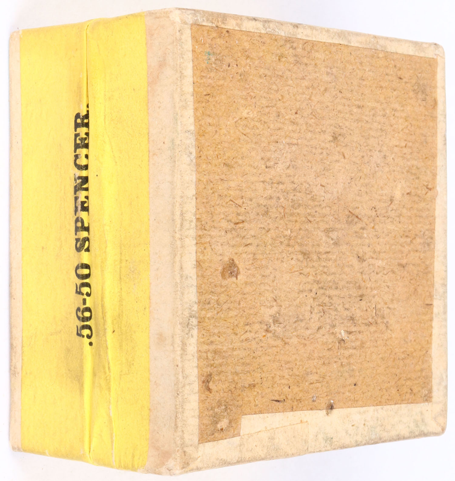 RARE! Winchester, .56-50 Rim Fire, For Spencer Arms, FULL & SEALED, 2pc. Buff box with green top & yellow side sealing labels, box is solid with excellent color, light age soiling, light rub marks, & light edge wear, labels are intact. Grade: Excellent ++ - Value: 700 to 1400