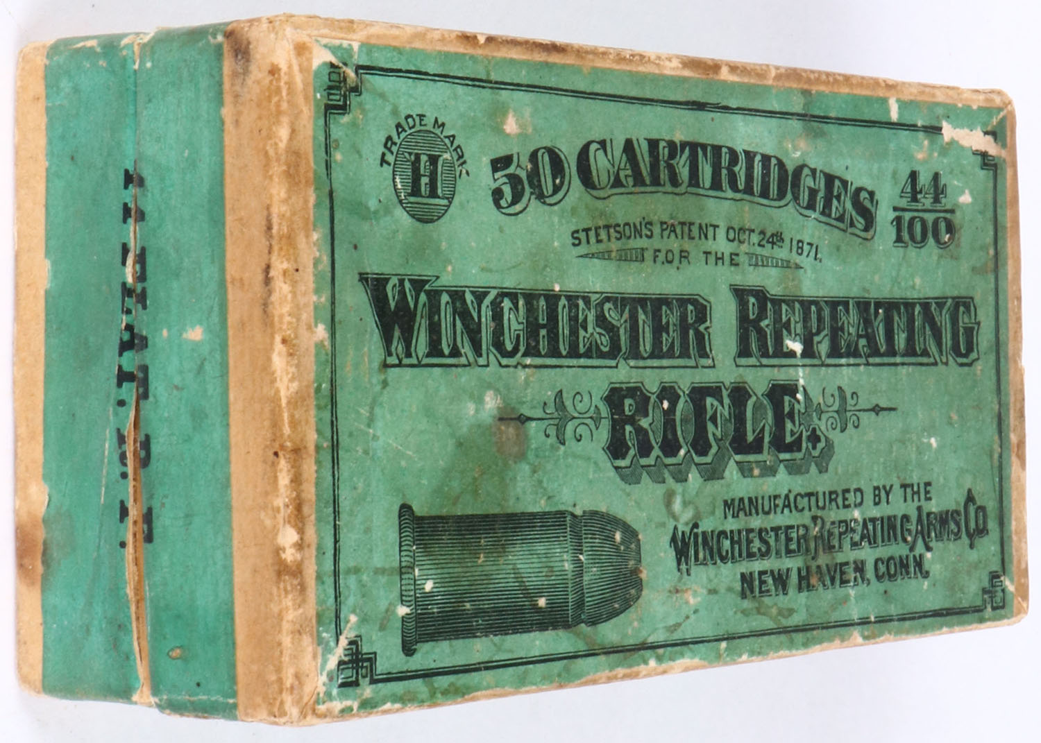 RARE & Early 1880's Winchester 44/100 Rim Fire, Has 44 FLAT. R.F. printed on both long ends & right side, 2 Pc., Full, box is solid with very good color, one side of seal label still intact, light age soiling/stains, rub marks & edge wear, ammo is very good. Grade: Excellent - Value: 4000 to 8000