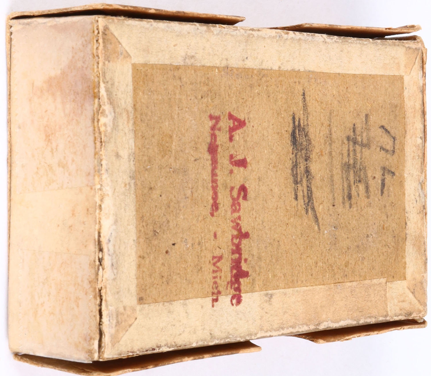 Winchester, .40 Cal, 90 Grains Powder, 370 Grains Patched Bullet, For Winchester Single Shot and Sharps Rifles, Full, 2pc. Buff box with green label & black print,, box is missing both ends of lid, has taped repaired seams, label has very good color, minor age soiling, minor edge & corner wear, label is intact, ammo is excellent. Grade: Good ++ - Value: 100 to 200