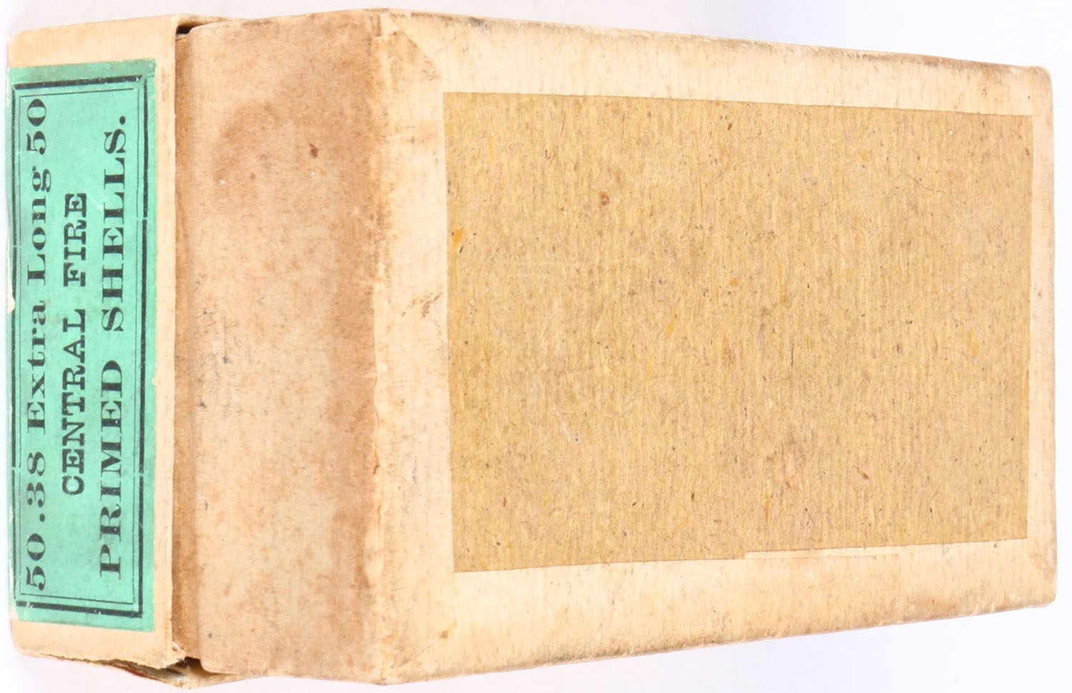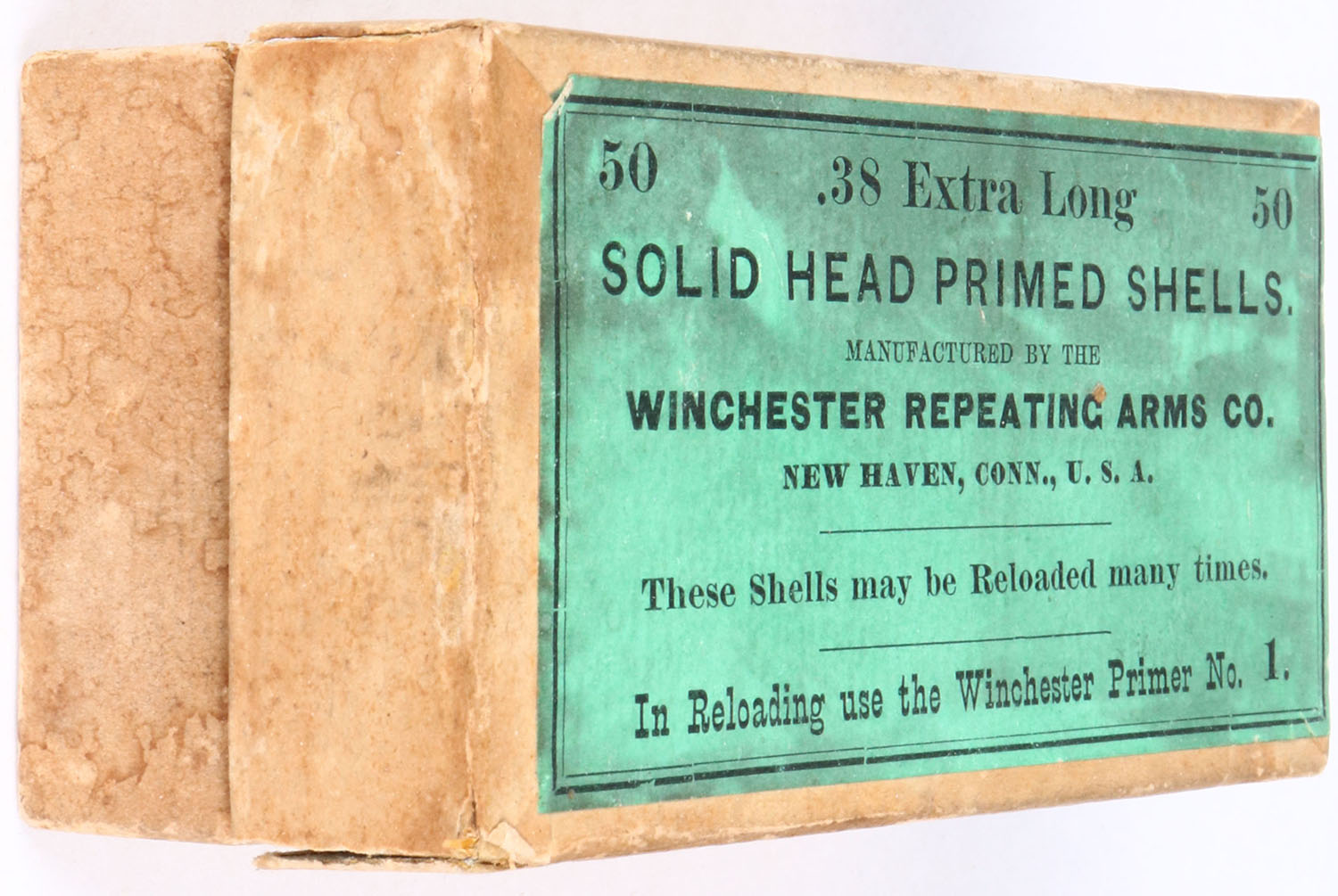Winchester, .38 Extra Long C.F., Solid head primed shells, 2pc, Full, buff box with green label & black print, box is solid with minor age soiling/stains, three corner seam splits on lid, & light rub wear, shells are fair. Grade: Very Good ++ - Value: 20 to 100