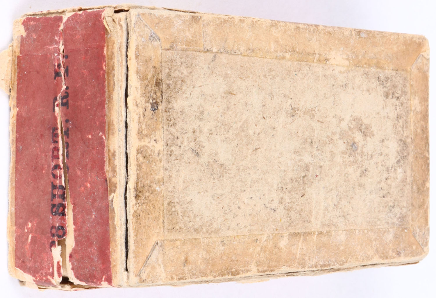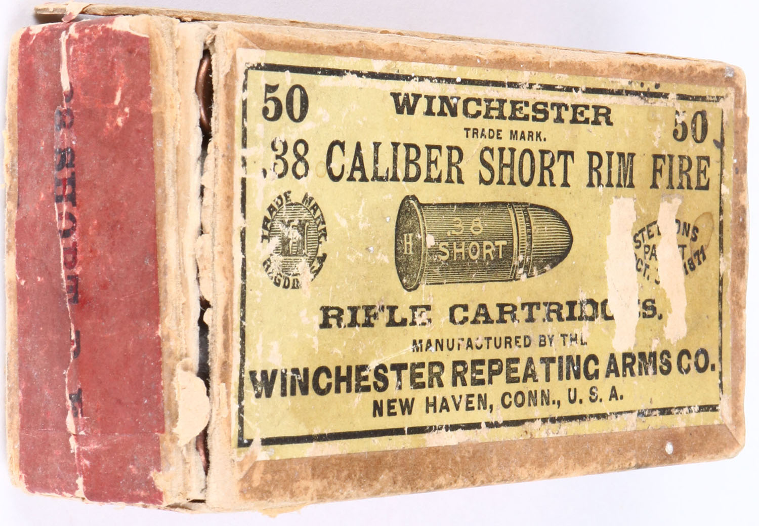 Winchester, .38 Short Rim Fire, Rifle Cartridges, Full, 2pc. Buff box with green top & red side sealing labels, box is weak with many split seams & is falling apart, rub marks, & edge wear, ammo is very good. Grade: Good + - Value: 50 to 150