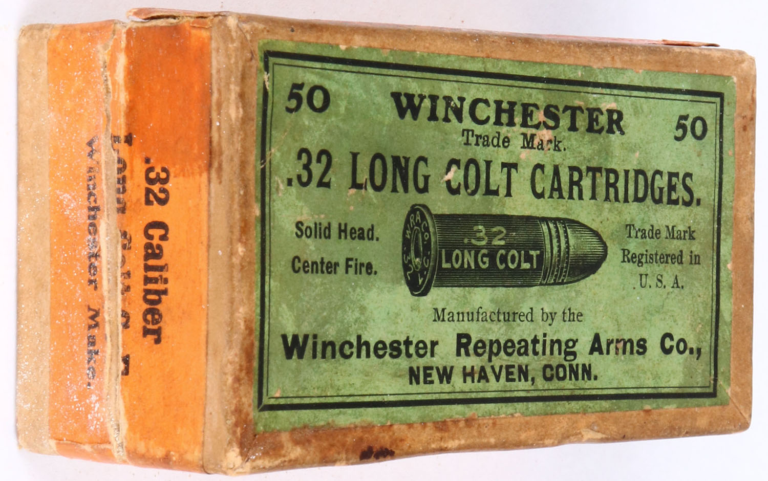 Winchester, .32 Long Colt, Solid Head, Full, 2pc. Buff box with green top & orange side sealing labels, box has two split corner seam on lid, light age soiling, light rub marks, & light edge wear, ammo is fair. Grade: Very Good ++ - Value: 40 to 80