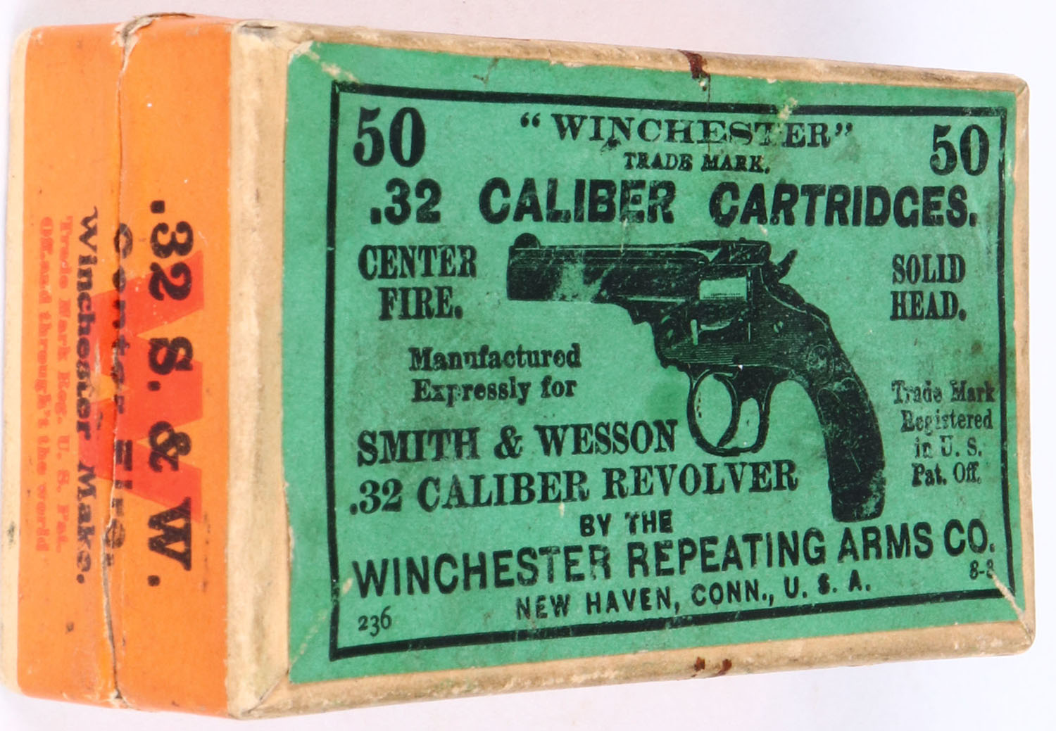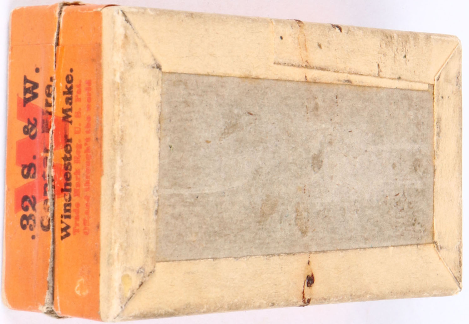 Winchester, .32 Smith & Wesson, Center Fire, Solid Head, Full, 2pc. Buff box with green top & orange side sealing labels, box is solid with excellent color, minor rub wear, & minor edge wear, ammo is good. Grade: Excellent + - Value: 20 to 60