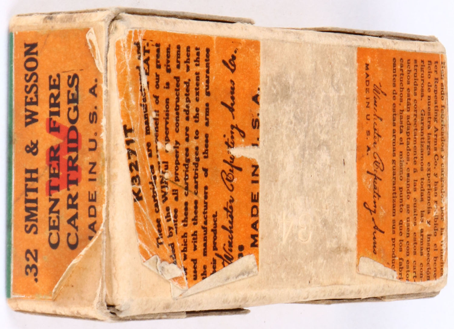 Winchester, .32 S&W, 85 Gr. Lead Bullet, 2pc, Full, buff box with green/orange label & black print, box is solid with excellent color, partial tear in box on front side, light rub marks, & minor edge wear, ammo is good. Grade: Excellent - Value: 30 to 90