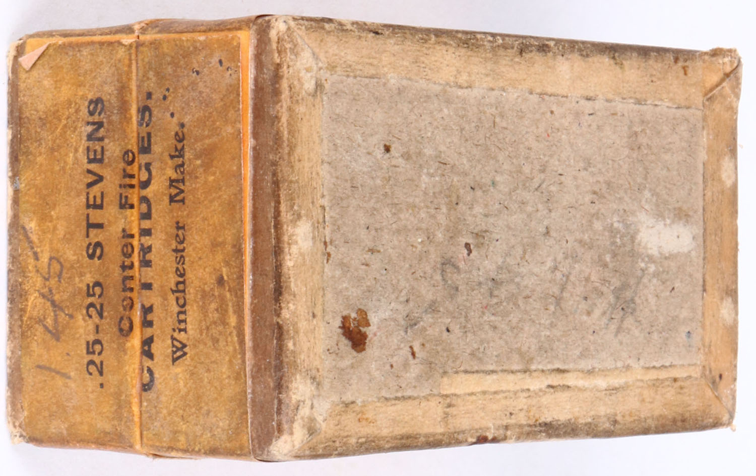 Winchester, .25-25 Stevens, Black Powder, 86 Grain Bullet, FULL & SEALED, 2pc. Buff box with orange and green labels, box is solid with age soiling, minor rub marks, & light edge wear. Grade: Very Good ++ - Value: 150 to 300