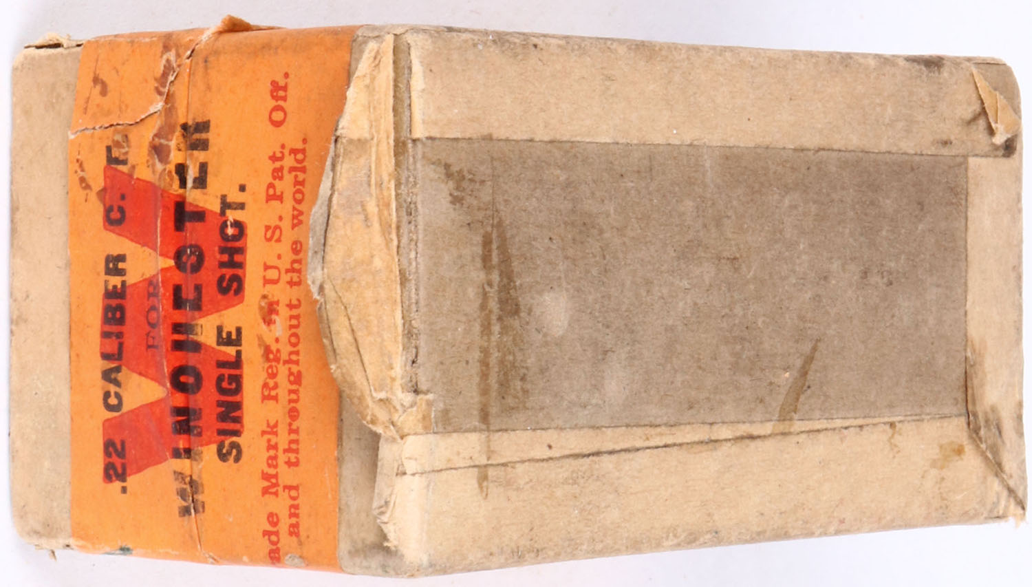 Winchester, .22 Winchester Single Shot, CF, 13 Grs. Powder, 45 Gr. Bullet, 2pc, FULL & SEALED, buff box with yellow/green label & black print, box is solid with light age soiling, rub marks & light edge wear. Grade: Very Good ++ - Value: 100 to 200
