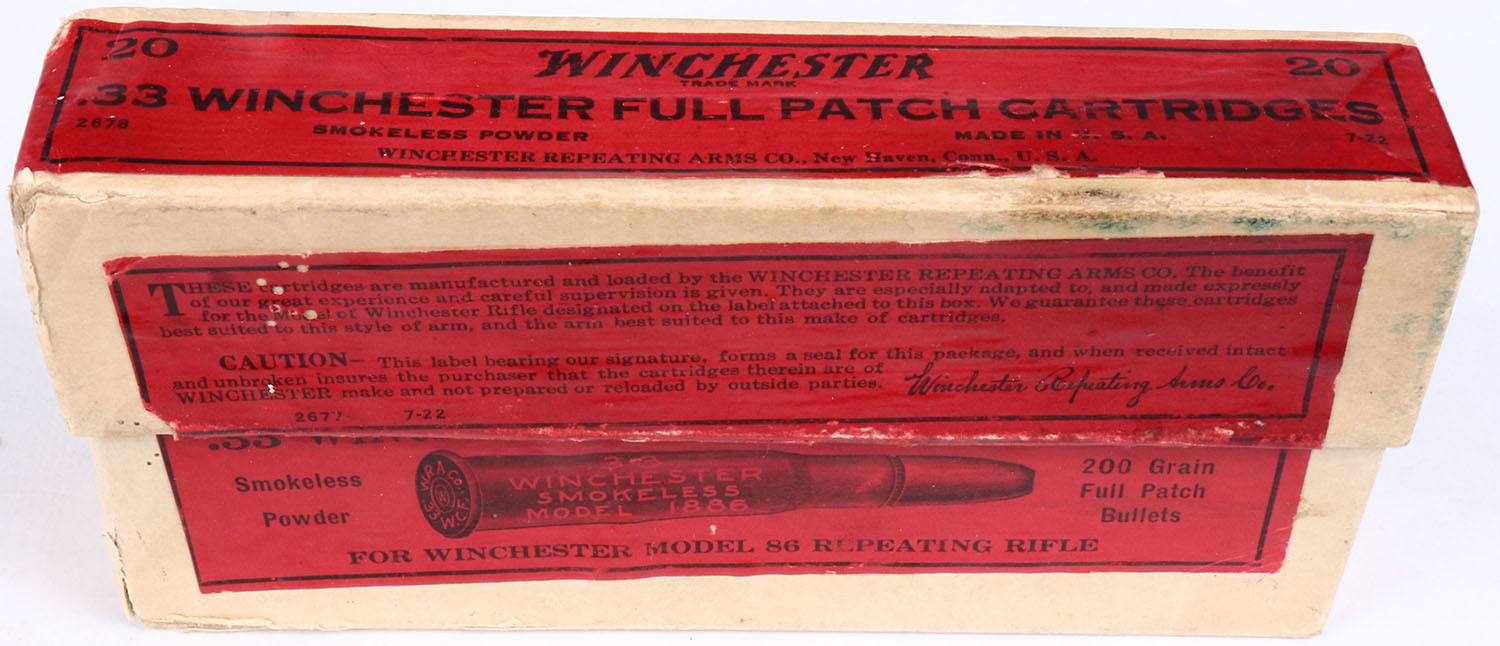 Winchester .33 Winchester, Smokeless, Model 1886, 200 Gr. Full Patch Bullets, 2pc., Full, buff box with red label & black print, box has one seam split on left end of bottom box, two partial seam splits on bottom of box, ammo is excellent. Grade: Excellent - Value: 100 to 300