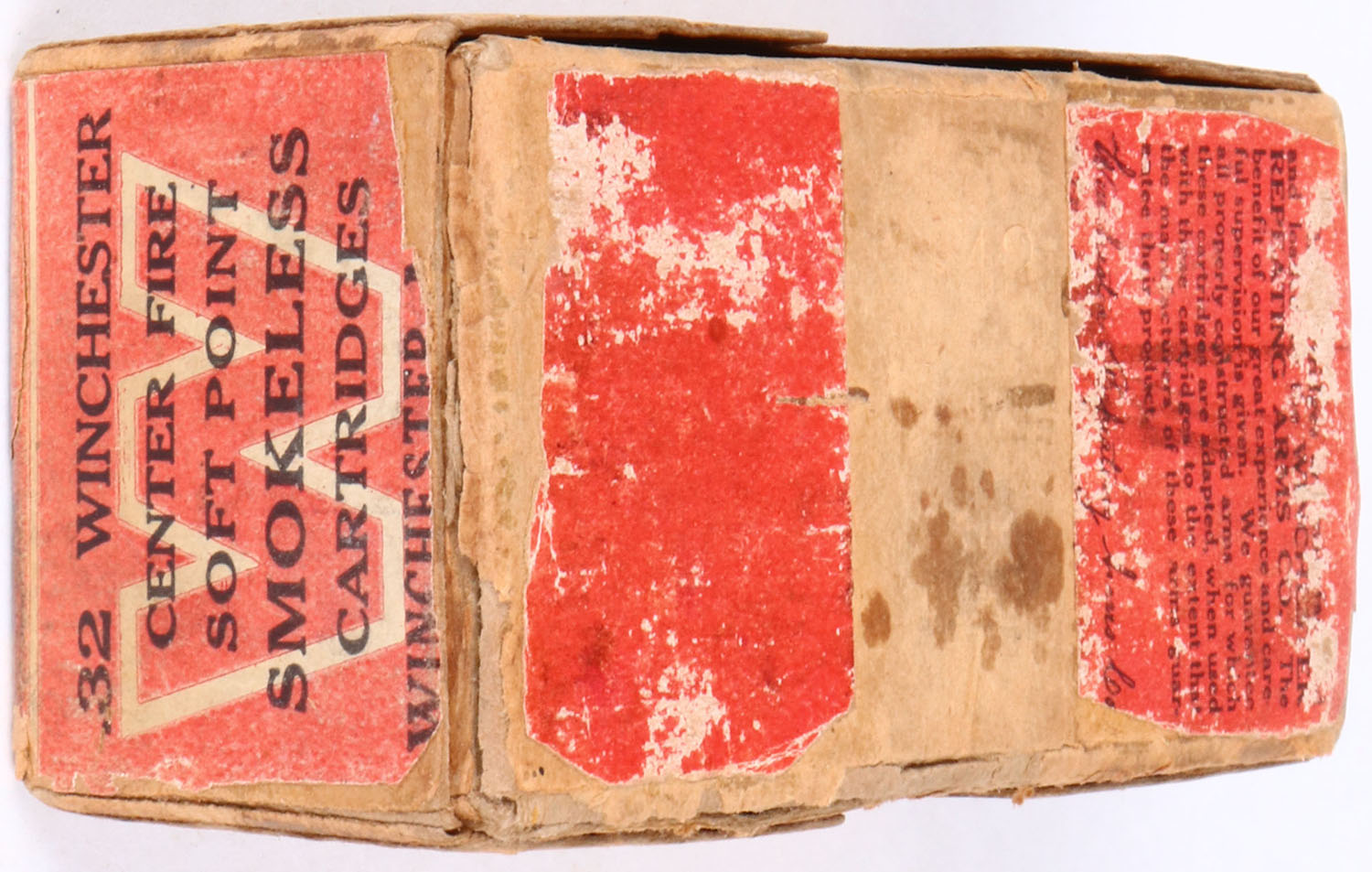 Winchester .32 Winchester Soft Point, Smokeless, 115 Gr. Soft point, , 2 Pc., partial 15 Rds., buff box with orange label & black print, box has four split seams, age soiling, light rub marks & edge wear, ammo is good. Grade: Very Good - Value: 50 to 100