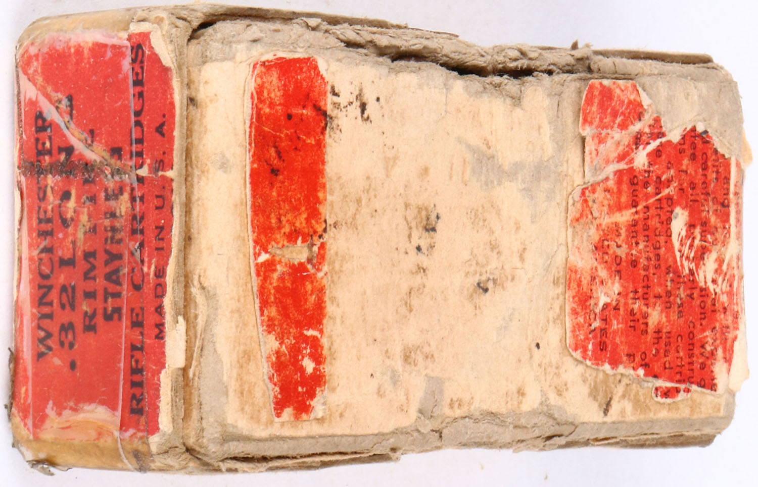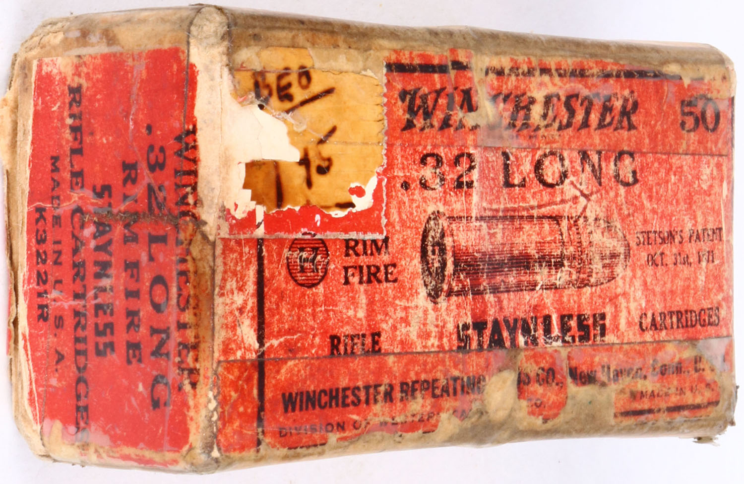 Winchester, .32 LONG, R.F., STAYNLESS, Rifle Cartridges, 2pc, Partial 38rds., buff box with orange label & black print, box is weak is tape all around box, partial splits seam on bottom, cardboard has been worn soft, stocker on top label, rub marks, & edge wear, ammo ranges from very good to good. Grade: Good ++ - Value: 10 to 40