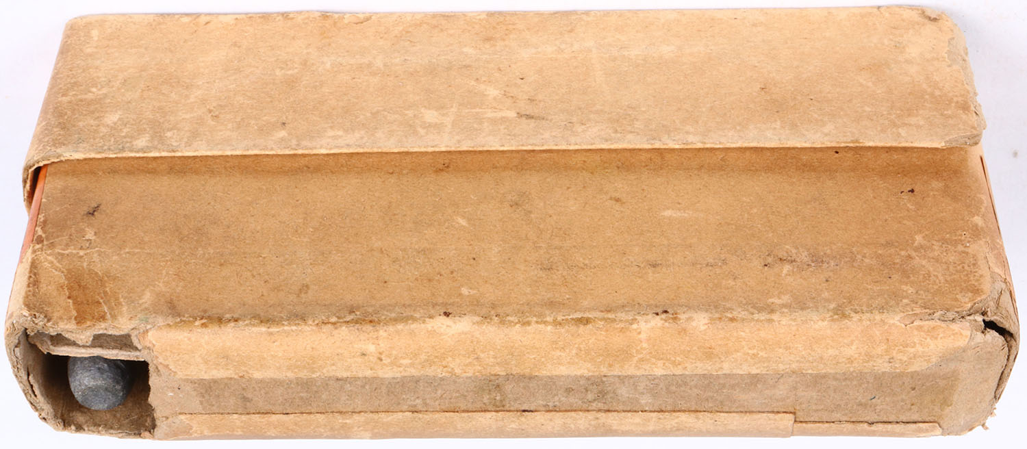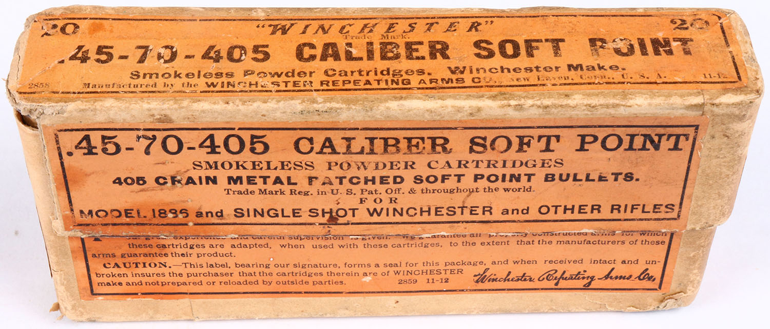Winchester .45-70-405, Smokeless, metal patched Soft Point bullet, 2pc., Full, buff box with orange label with black print, left end flap missing on lid, slit seam on bottom, small chunk of box missing from bottom, light rub marks, & light edge wear, ammo is excellent. Grade: Excellent ++ - Value: 100 to 200