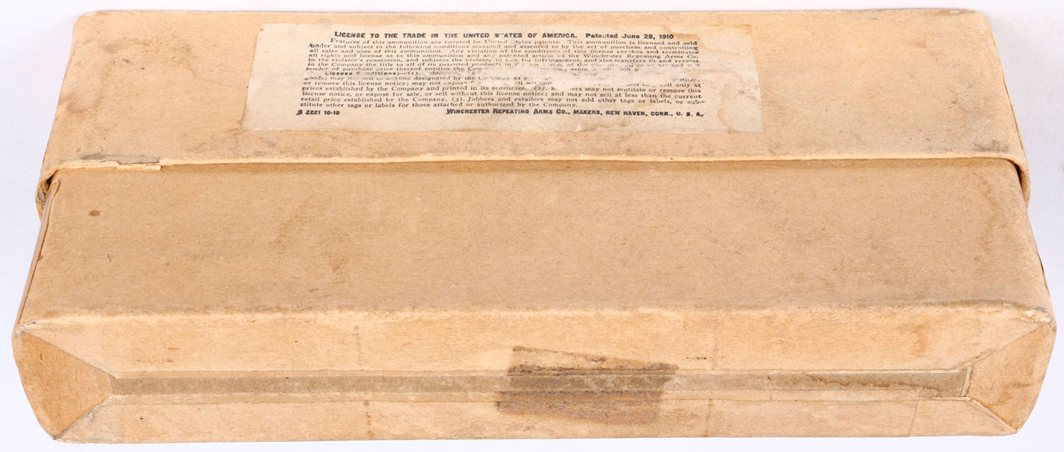 Winchester, .38-56 Winchester, Smokeless, 255 Gr. Soft point bullet, 2pc, Full, buff box with orange label & black print, box is solid with very good color, light staining, light rub marks, & light edge wear, ammo is excellent. Grade: Excellent - Value: 60 to 180