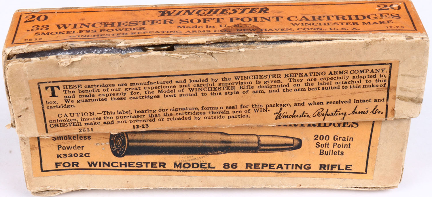 Winchester, .33 Winchester, Smokeless Powder, 200 Grain Soft Point Bullets, Partial 11 Rds., 2pc. Buff box with orange label & black print, box has multiple seam splits on lid & bottom box, inside tape seam repairs, stains, light age soiling, rub marks & edge wear, ammo ranges from very good to good. Grade: Good ++ - Value: 50 to 200