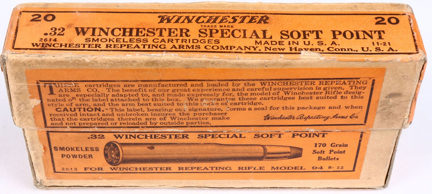 Winchester, .32 Winchester Special, Smokeless, 170 Grs. Soft point bullet, 2pc, Full, buff box with orange label & black print, box is solid with very good color, very minor age soiling in spots, small dent in back of box, light rub marks, & light edge wear, ammo is very good. Grade: Excellent - Value: 60 to 120