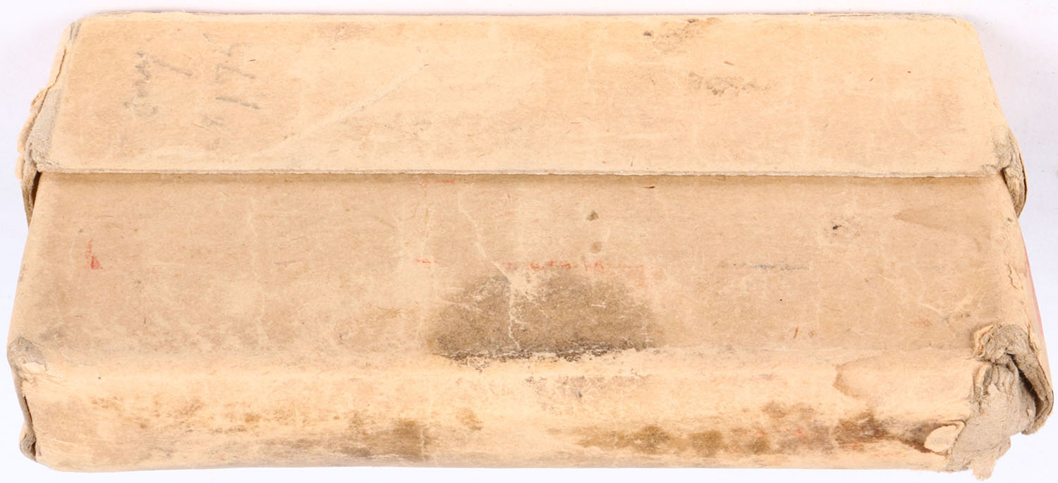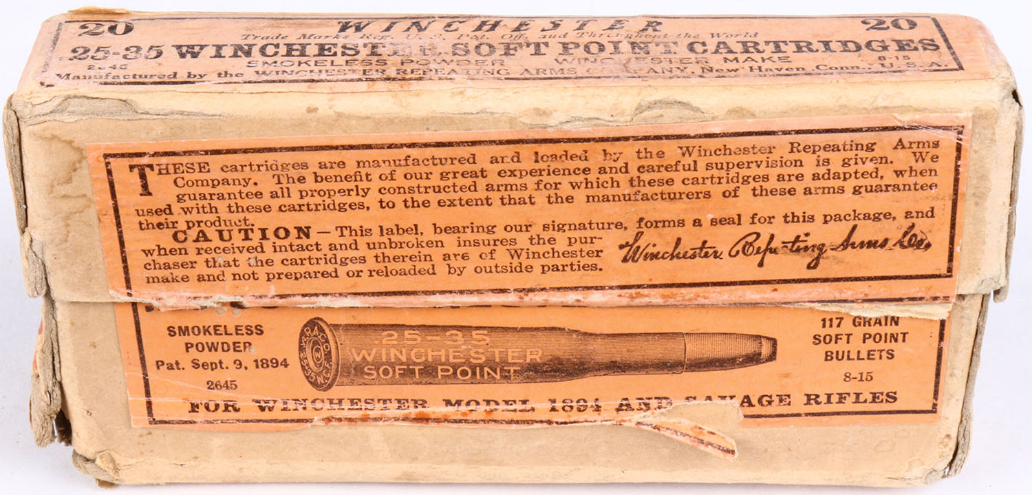 Winchester, 25-35 Winchester, Smokeless, 117 Gr. Soft point bullet, 2pc., Full, buff box with orange label & black print, box seam split on left end of bottom box, light age soiling, handling wear, rub marks & edge wear, ammo is Excellent. Grade: Very Good + - Value: 50 to 150