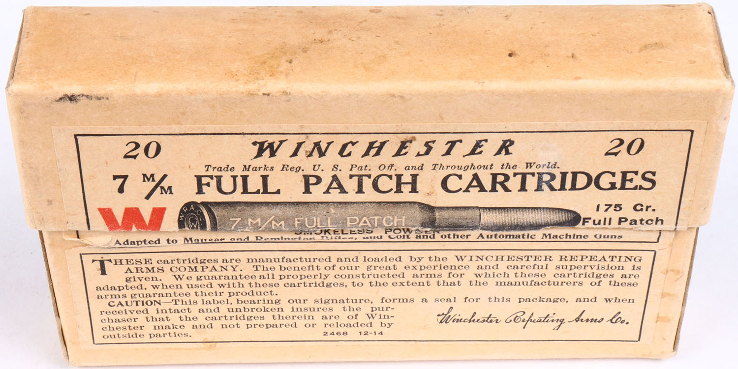 Winchester, 7mm, 175 Gr. Full patch bullet, 2pc, Full, buff box & label with black print, box has very good color, light stains on back, minor rub marks, & light edge wear, ammo is good. Grade: Excellent - Value: 20 to 40