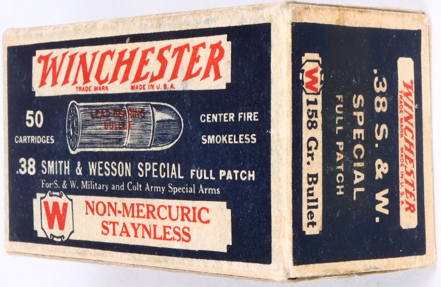 Winchester, .38 S&W Special, OVERSTAMP ''LEAD BEARING BULLET'', Non-Mercuric, Staynless, OVERSTAMP U.S.A. Patent Pending, Oil Proof, 158 Gr. Full patch Bullet, Full, 1pc. Blue white & red box, box is solid with excellent color, minor rub marks, & light edge wear, ammo is excellent. Grade: Excellent ++ - Value: 200 to 600