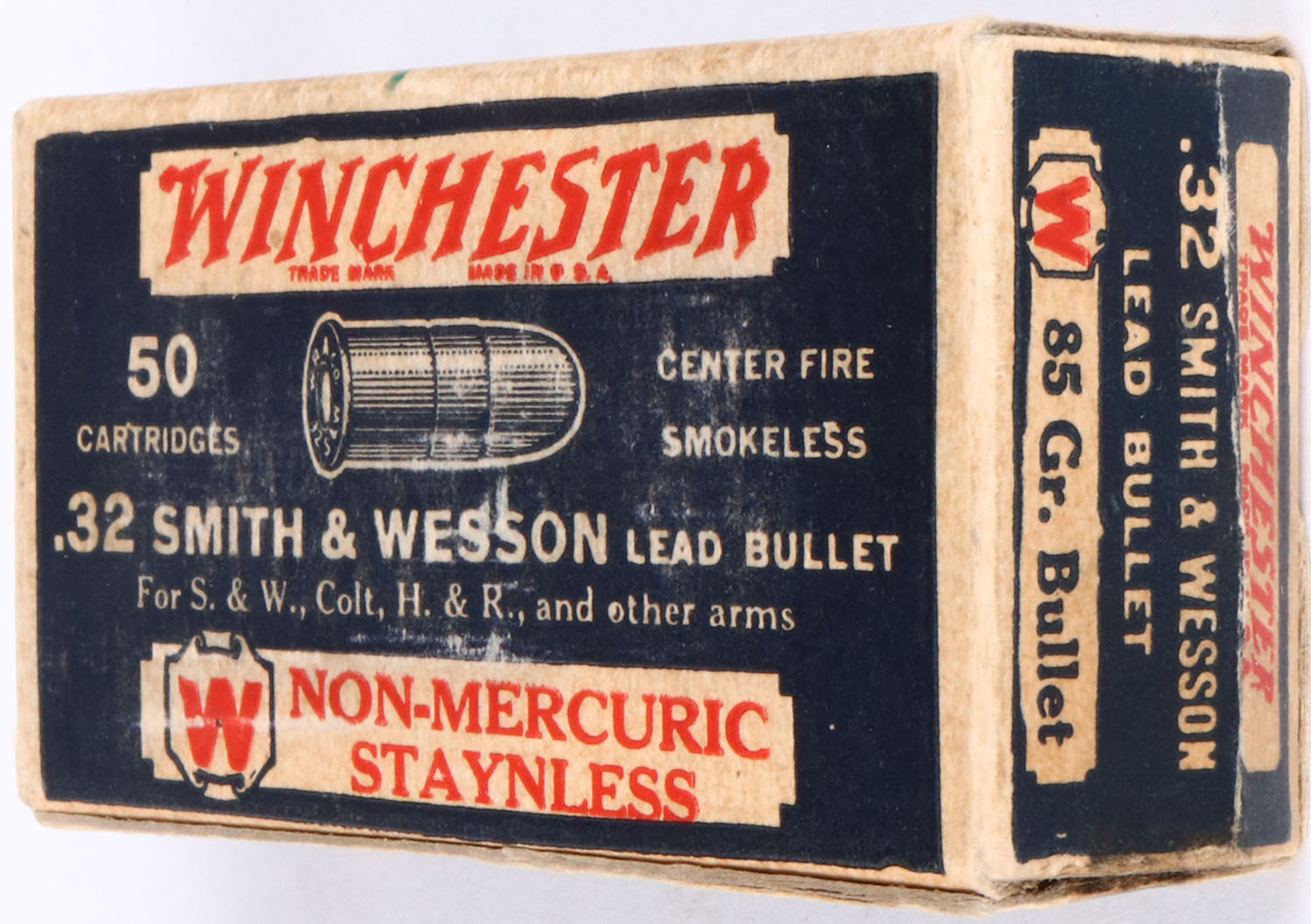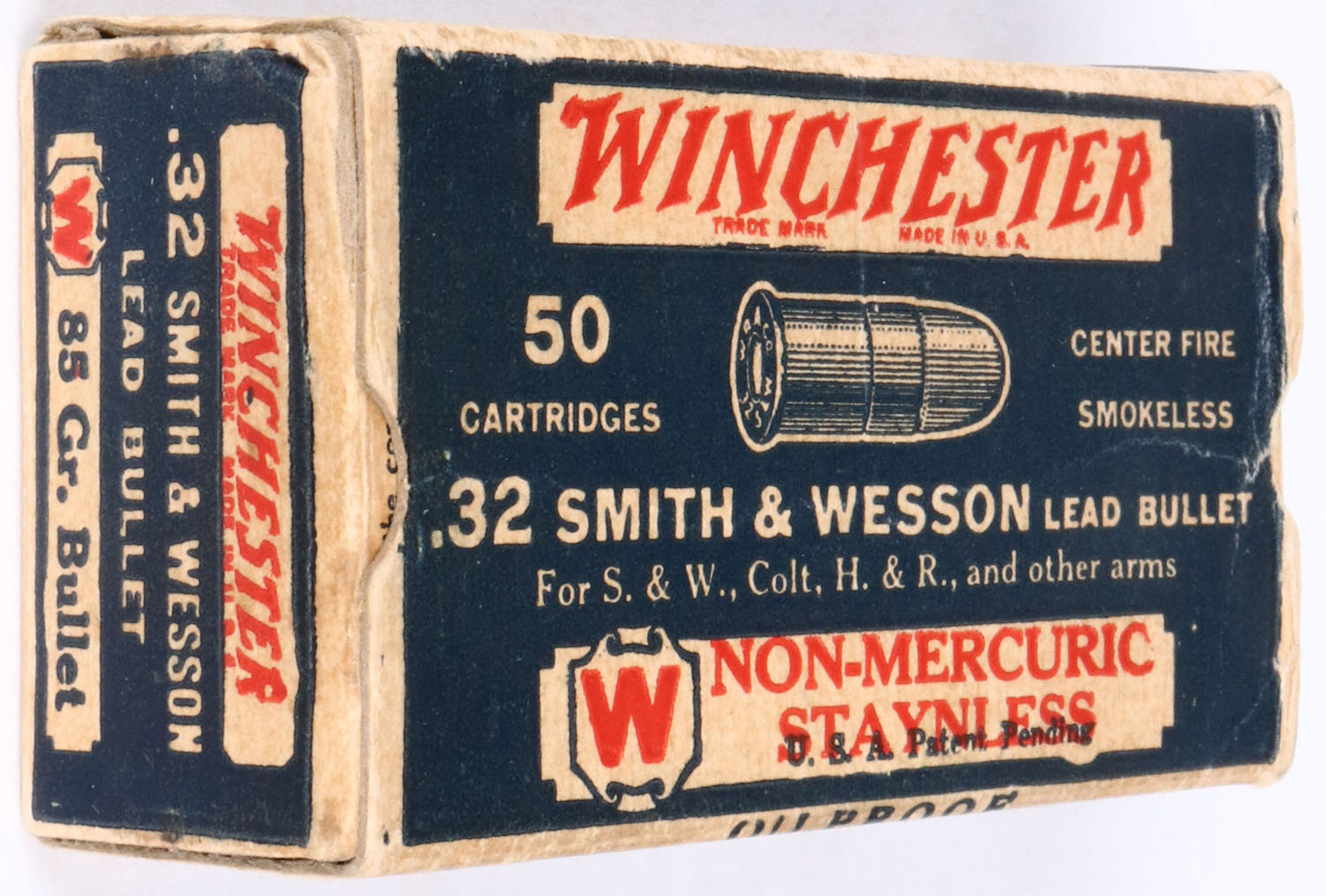 Winchester, .32 S&W, OVERSTAMP, Non-Mercuric, Staynless, OVERSTAMP U.S.A. Patent Pending, Oil Proof, 85 Gr. Lead Bullet, Partial 19 Rds., 1pc. Blue white & red box, box is solid with very good color, light rub marks, & light edge wear, ammo is excellent. Grade: Excellent - Value: 10 to 30