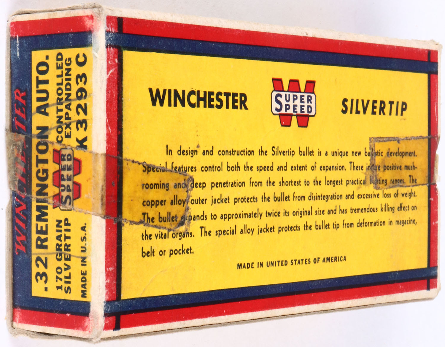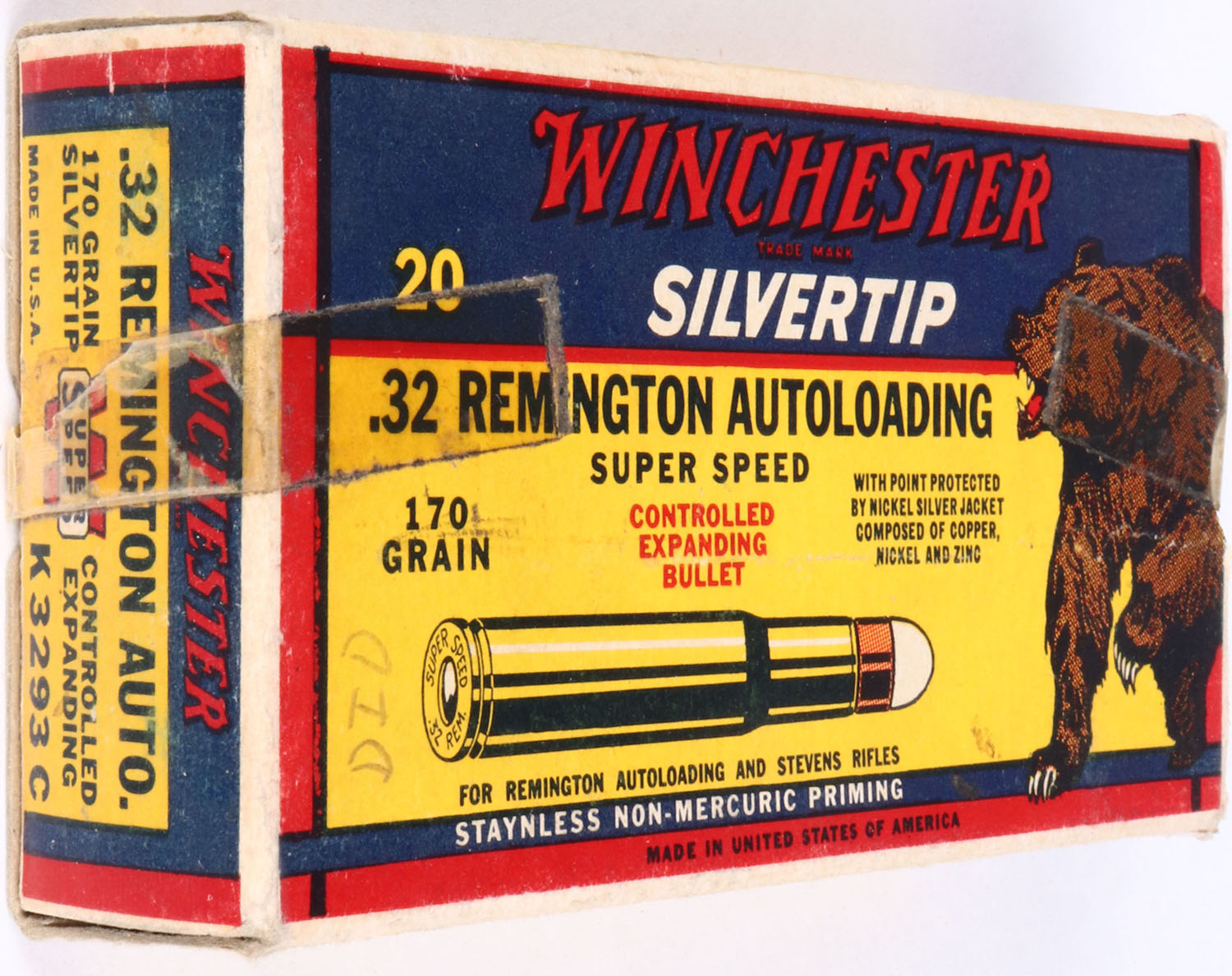 Winchester, BEAR BOX, Silvertip, .32 Remington Autoloading, 170 Gr. Bullet, Super Speed, 1pc, Full, white box with blue/yellow/red label & red/black/white print, box is solid with excellent color, tape on both end flaps, pencil marks, light rub marks, & light edge wear, ammo is excellent. Grade: Excellent + - Value: 30 to 90