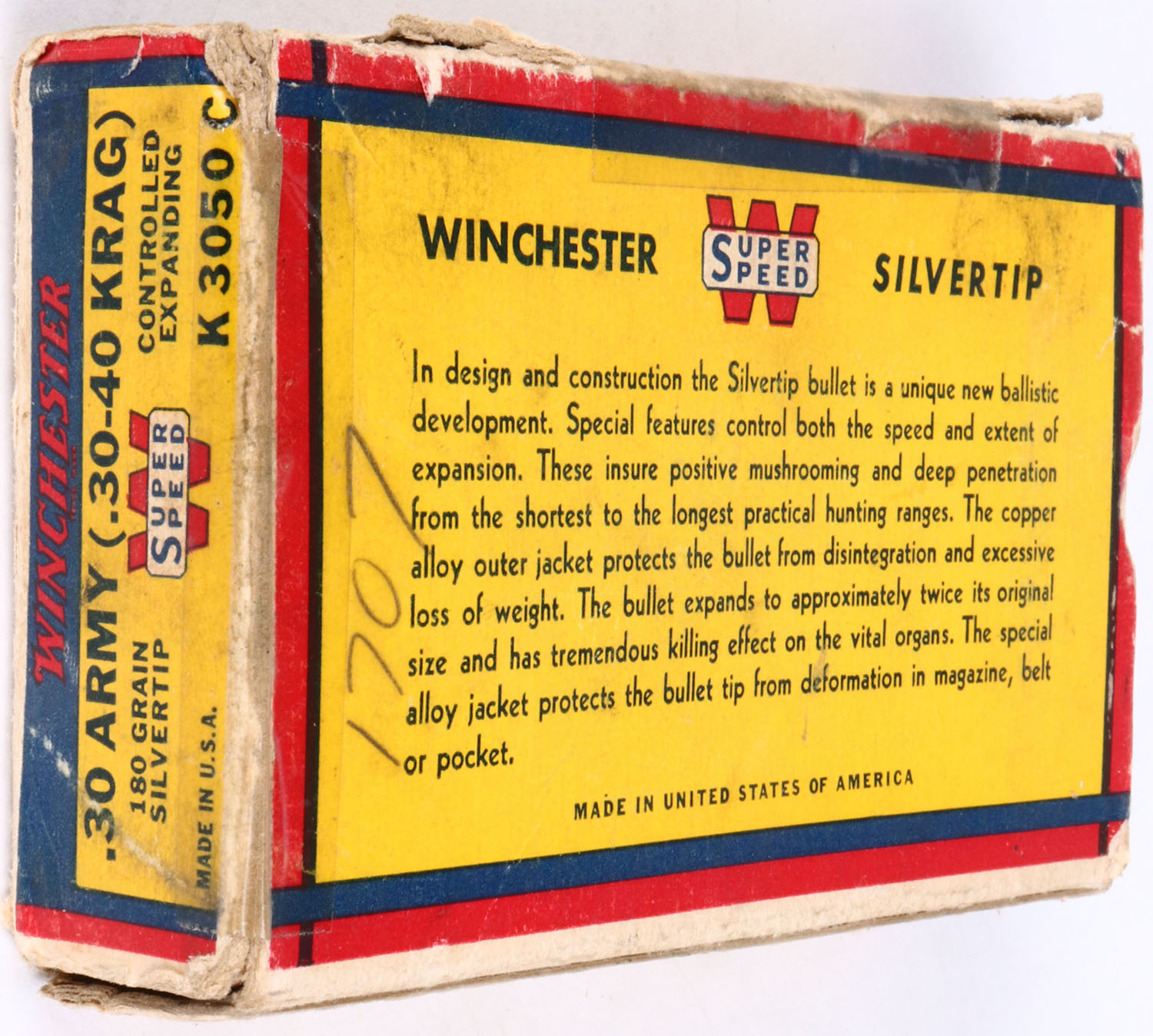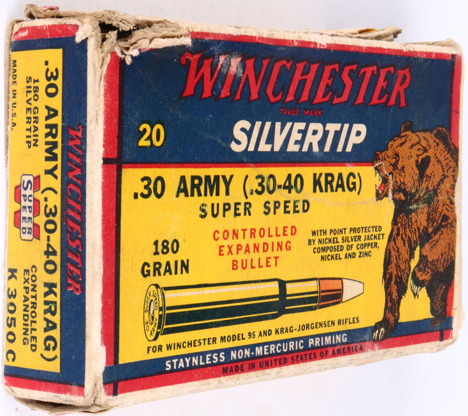Winchester, BEAR BOX, Silvertip, .30 Army (.30-40 Krag), 180 Gr. Bullet, Super Speed, 1pc, Full with 7 Soft Point Rds., white box with blue/yellow/red label & red/black/white print, box has one split seam with tape repair, one end flap seam repair with tape, one partial split seam, chunk of box on top side missing, pencil marks, rub marks & edge wear, ammo is excellent. Grade: Very Good - Value: 30 to 90