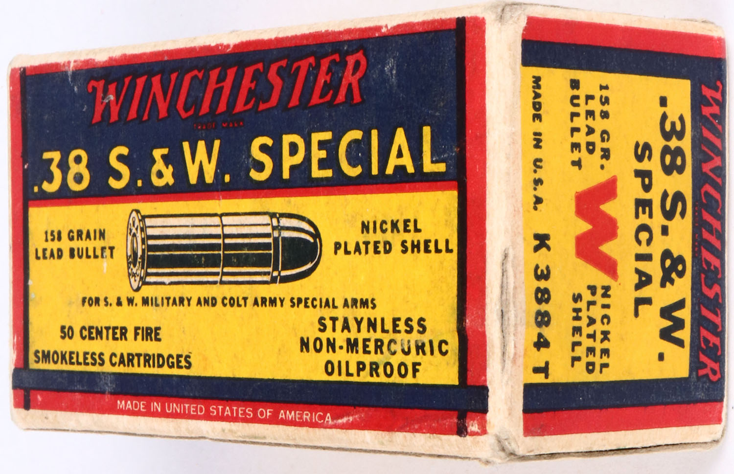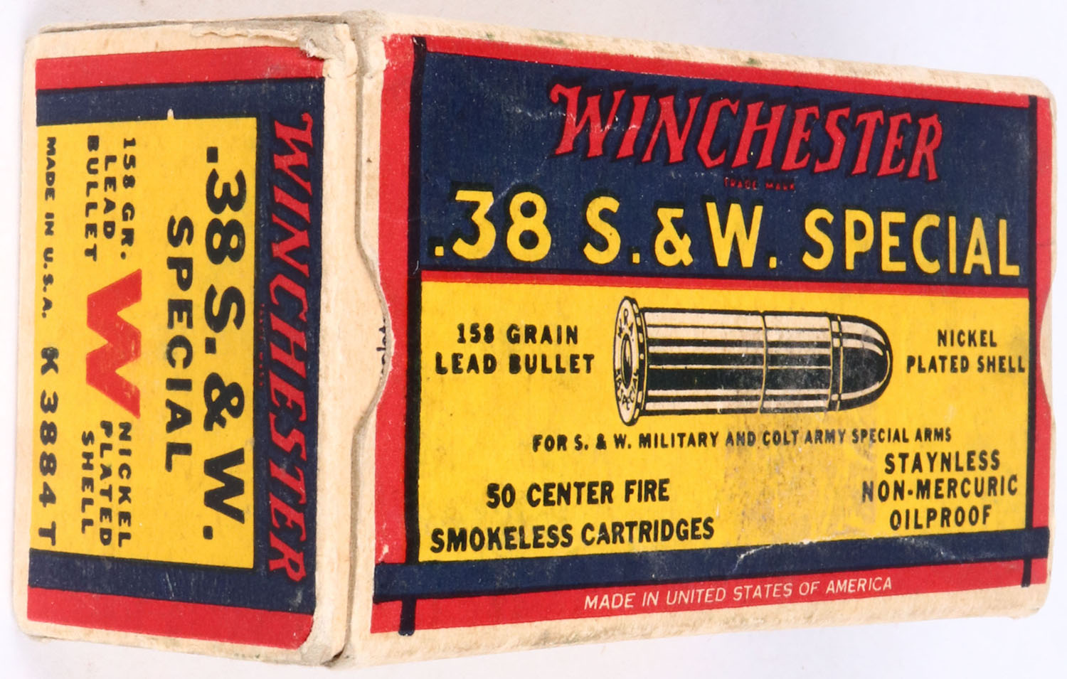 Winchester, .38 S&W Special, 158 Gr. Lead Bullet, nickel plated shell, 1pc, Full, white box with blue/yellow/red label & red/black/white print, box is solid with very good color, light rub marks, & light edge wear, ammo is excellent. Grade: Excellent - Value: 40 to 80