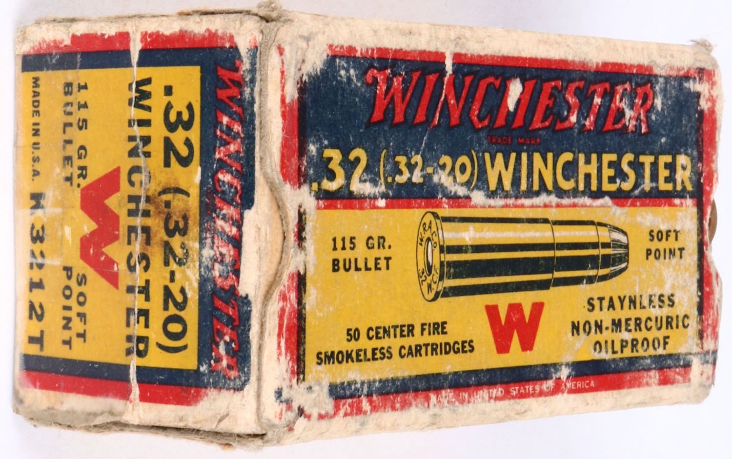 Winchester, .32-20 Winchester, 115 Gr. Soft point Bullet, 1pc, Full, white box with blue/yellow/red label & red/black/white print, box is missing right end flap, left end flap is taped on, heavy rub marks, & heavy edge wear, ammo is very good to excellent. Grade: Very Good - Value: 30 to 150