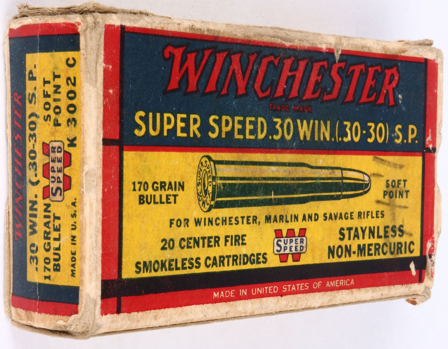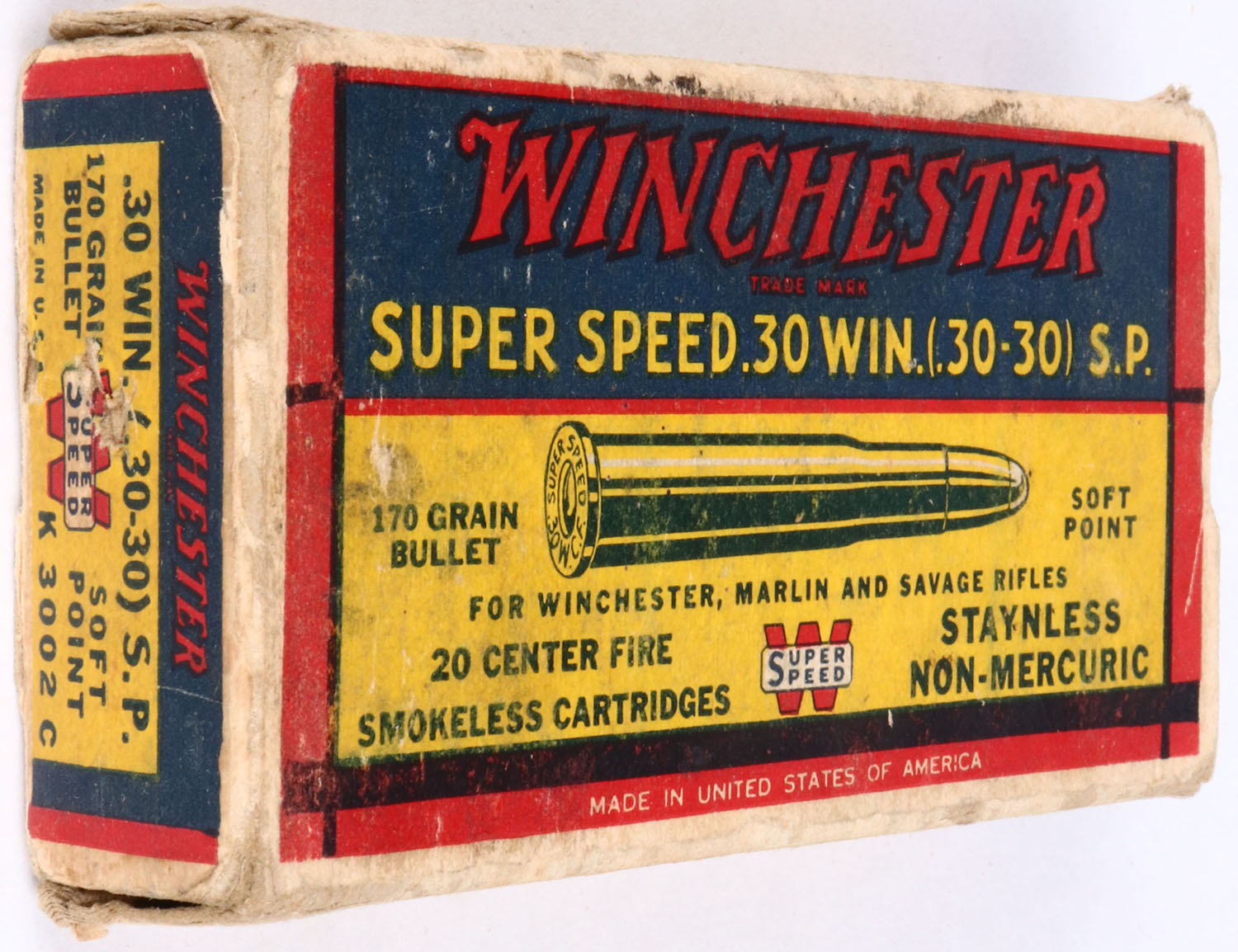 Winchester, .30 Win.(.30-30), 170 Gr. Soft point Bullet, 1pc, Partial 11 correct Rds., 6 Super-X Rds. 3 S.A.corp Rds., white box with blue/yellow/red label & red/black/white print, box solid with age soiling, light pen marks, rub marks, & edge wear, ammo is very good to excellent. Grade: Very Good ++ - Value: 50 to 150