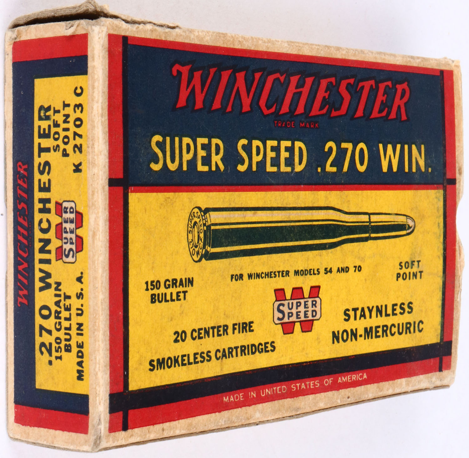 Winchester, .270 Win, Super Speed, 150 Gr. Soft point Bullet, 1pc, Full, white box with blue/yellow/red label & red/black/white print, box has one partial split seam, light age soiling, light rub marks & light edge wear, ammo is excellent. Grade: Very Good ++ - Value: 20 to 60