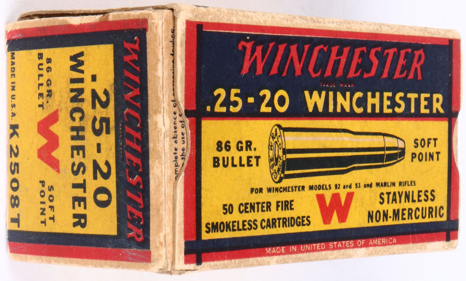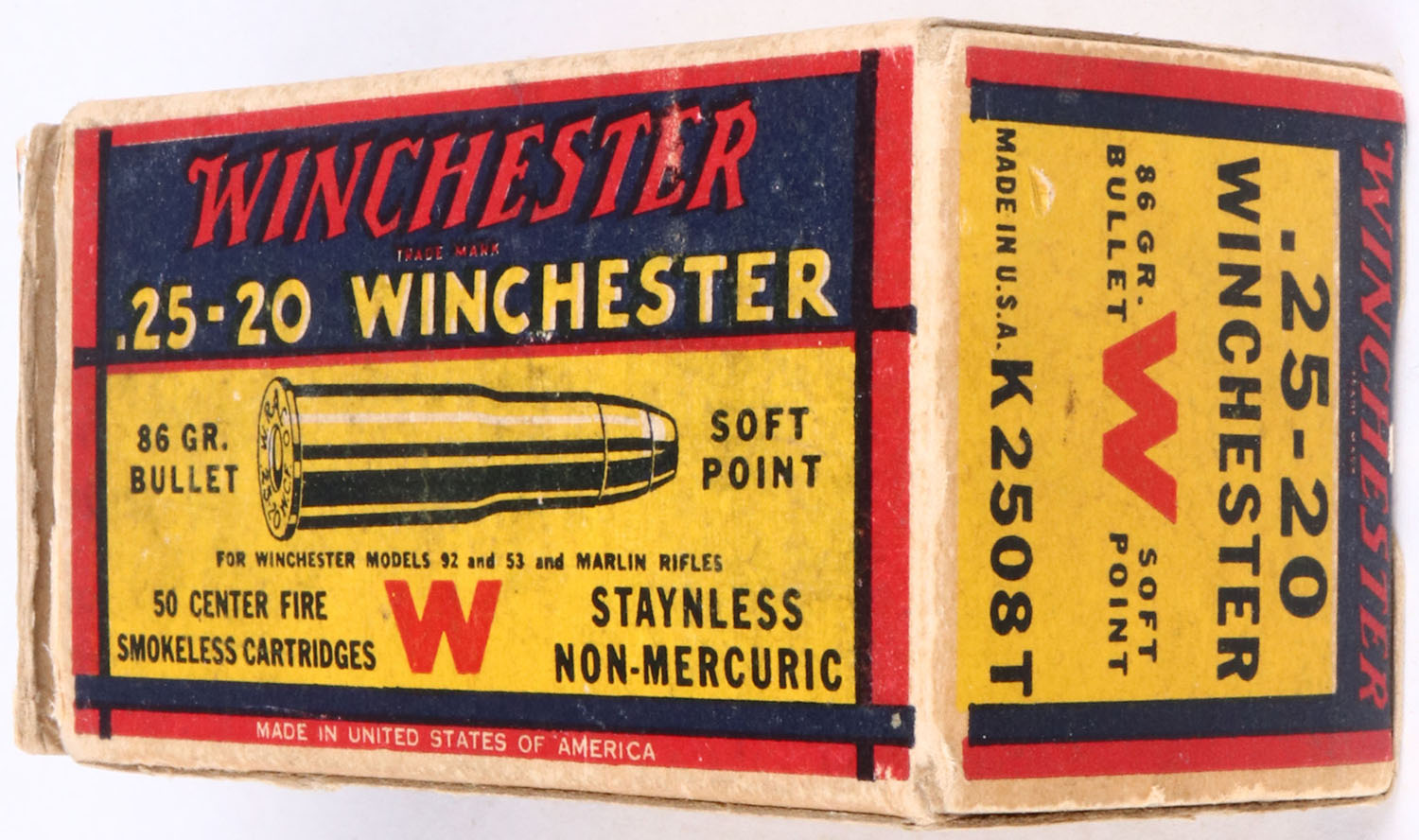 Winchester, .25-20 Winchester, 86 Gr. soft point Bullet, 1pc, Partial Approx. 40 Rds., white box with blue/yellow/red label & red/black/white print, box has left end flap detached, very good color, minor rub marks, & light edge wear, ammo is very good. Grade: Excellent - Value: 50 to 150