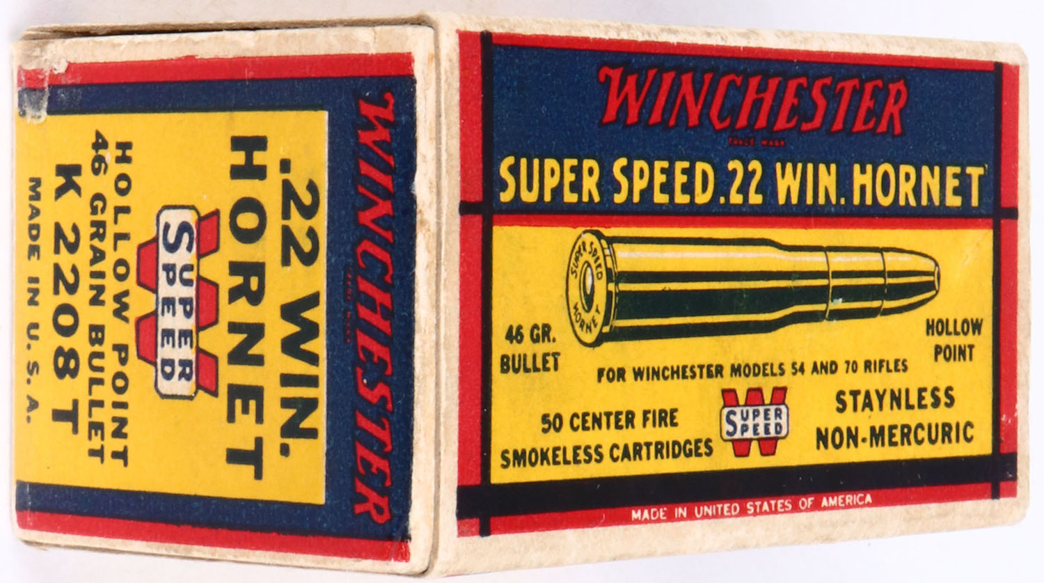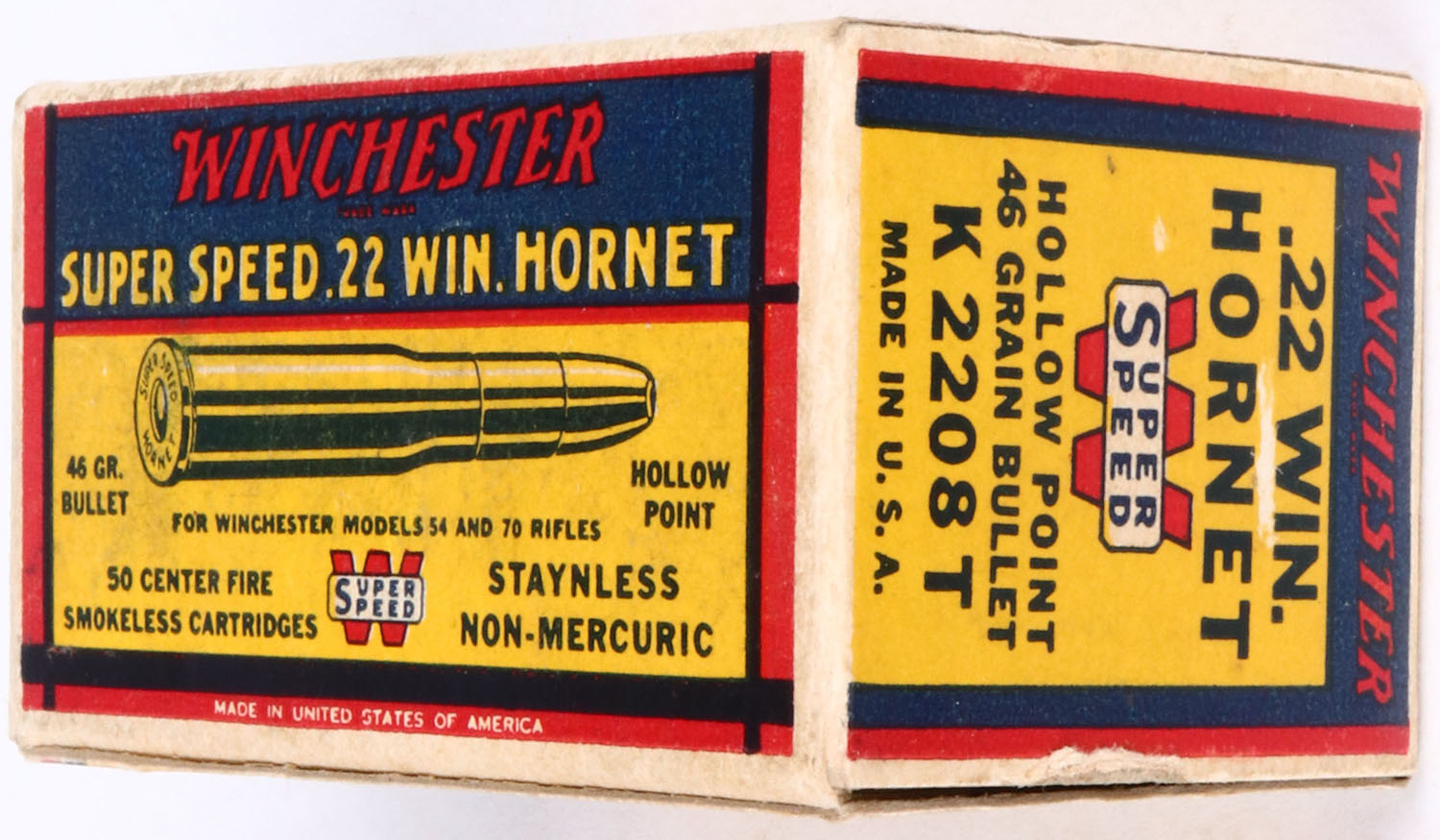 Winchester, .22 Win. Hornet, Super Speed, 46 Gr. Hollow point bullet, 1pc, Full, white box with blue/yellow/red label & red/black/white print, box is solid with excellent color, & minor wear, ammo is very good. Grade: Excellent ++ - Value: 100 to 300