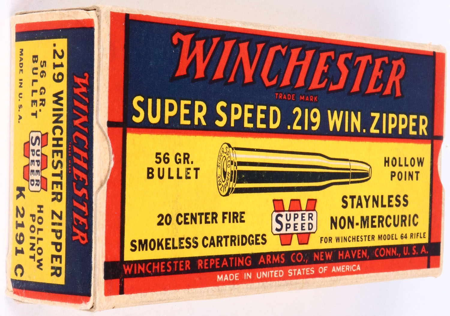 SCARCE & EARLY!! Winchester, .219 Win. Zipper, Super Speed, 56 Gr. Hollow point Bullet, Early 1938 Box, 1pc, Full, white box with blue/yellow/red label & red/black/white print, box is solid with excellent color, minor handling wear, & minor rub wear, ammo is excellent. Grade: Excellent ++ - Value: 400 to 1000