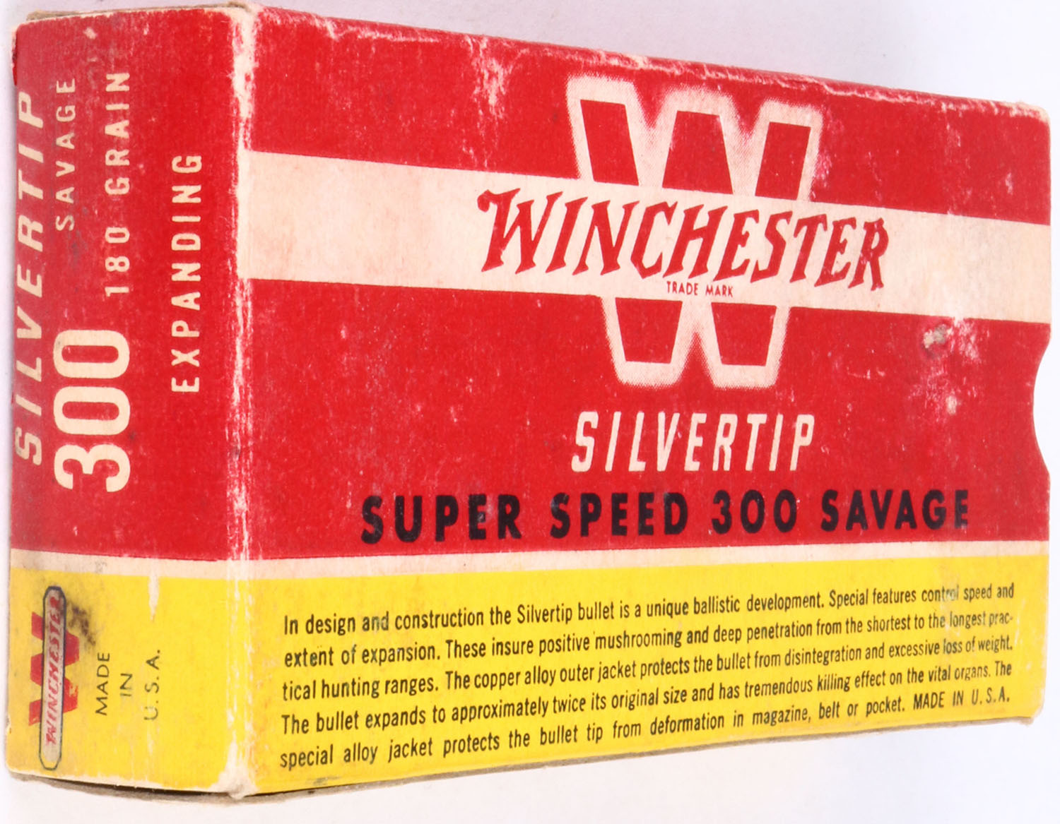 Winchester, Silvertip, .300 Savage, Super Speed, 180 Gr. Bullet, 1pc, Full, red & yellow box with white & black print, box is solid with rub marks, & edge wear, ammo is excellent. Grade: Excellent - Value: 30 to 60