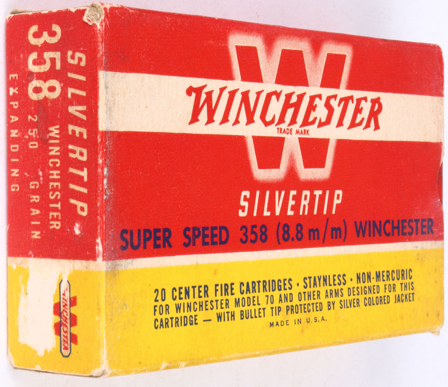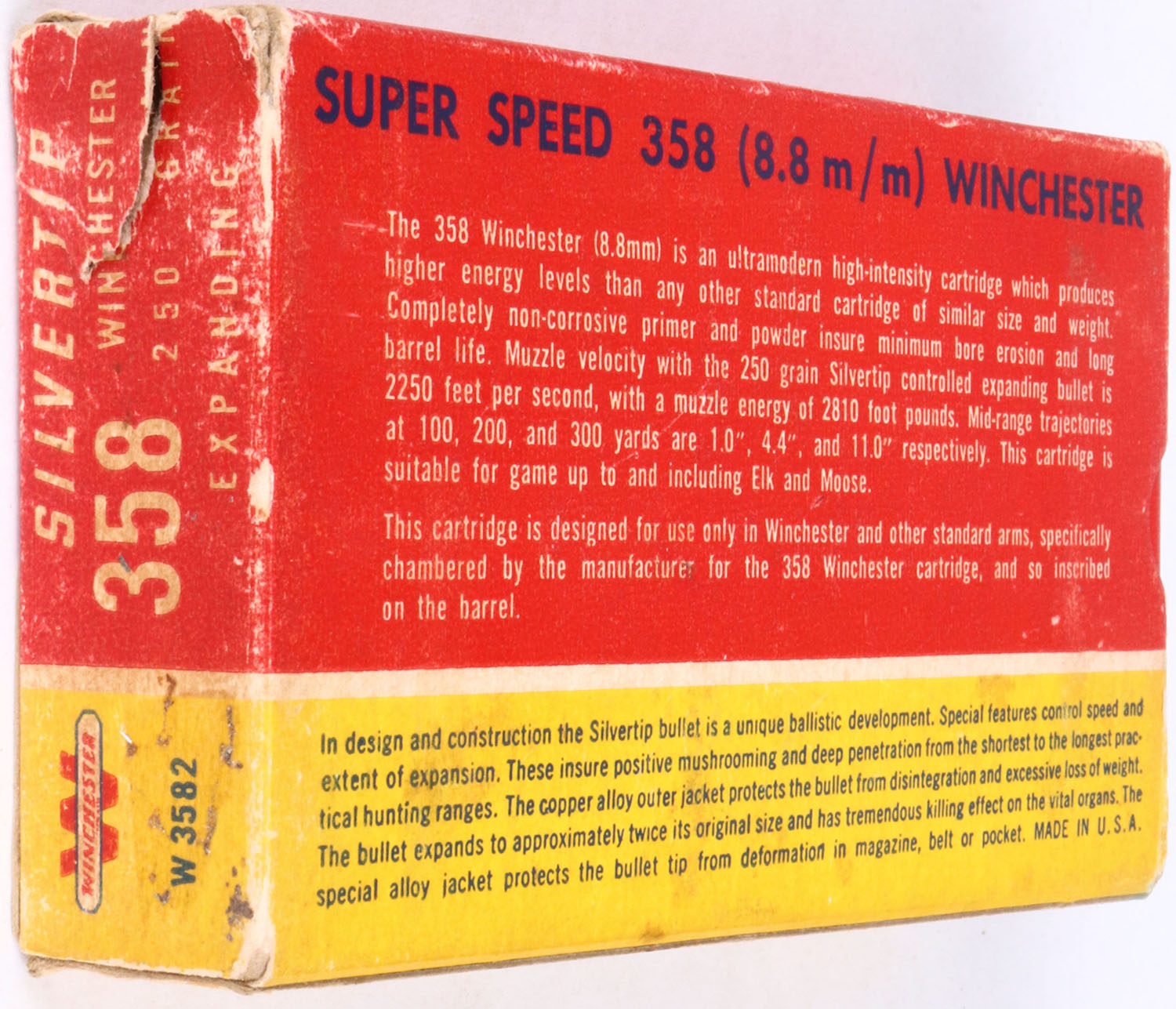 Winchester, Silvertip, .358 (8.8mm) Winchester, Super Speed, 250 Gr. Soft point Bullet, 1pc, Full, red & yellow box with white & black print, box is solid with light age soiling, rub marks, & edge wear, ammo is excellent. Grade: Very Good ++ - Value: 50 to 200